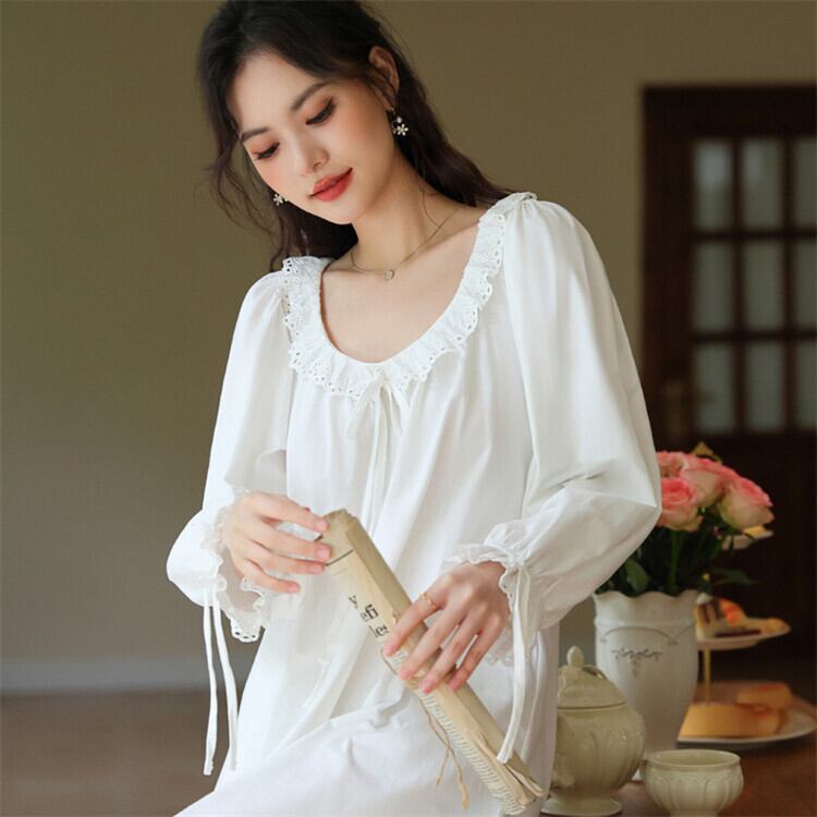 ネグリジェ ワンピース 長袖 レディース M-XL 綿 Uネック 部屋着 ナイトウェア ロング丈 25zm101