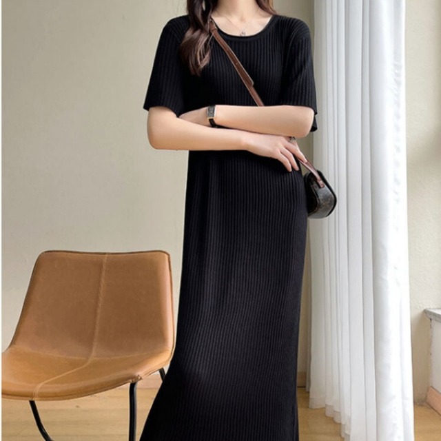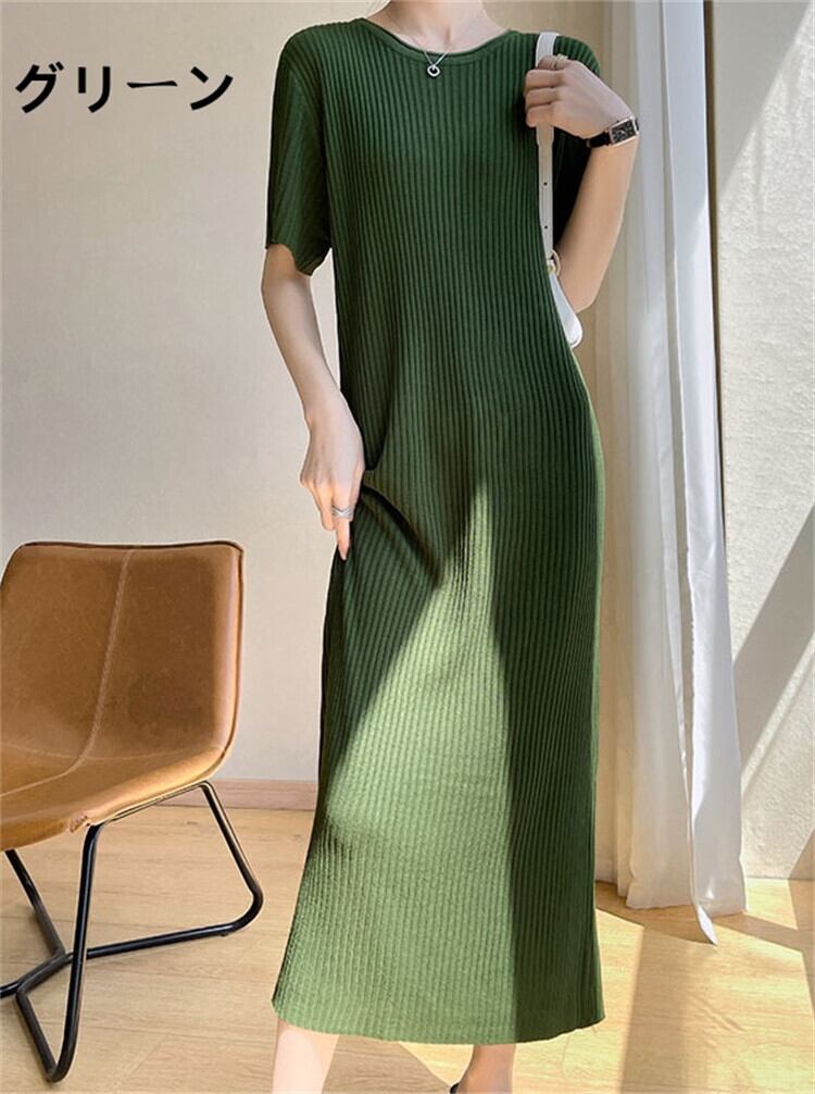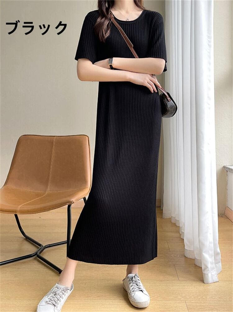 ニットワンピース タイトワンピース レディース 4色 M-XL 半袖 サマーニット ロング丈 無地 接触冷感 25zm551