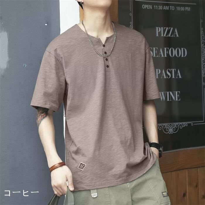 tシャツ 半袖 プルオーバー メンズ 4色 M-3XL ヘンリーネックtシャツ 薄手 Vネック 春夏 カジュアル おしゃれ 25zm621