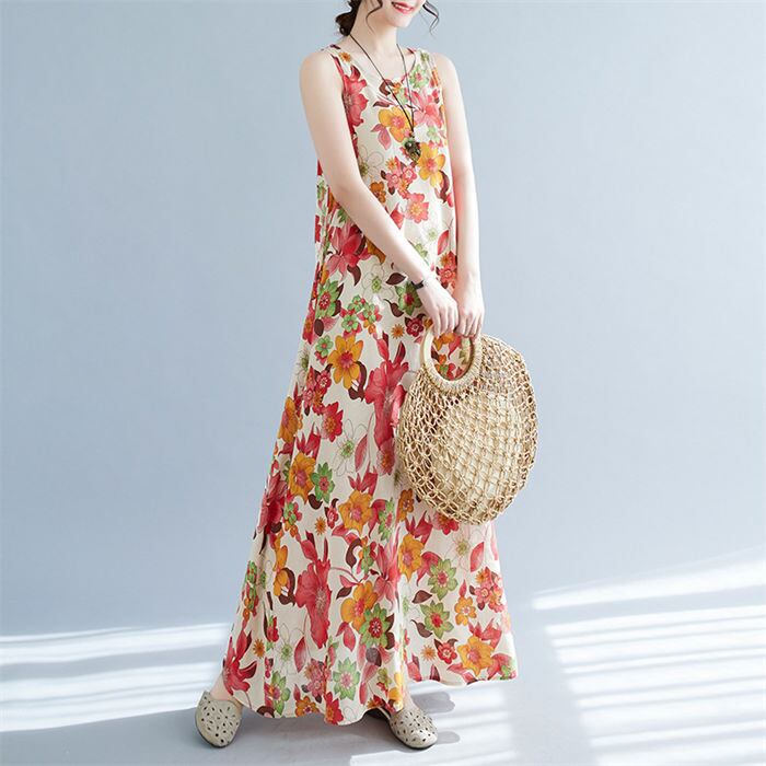 ■商品:リゾートワンピース ノースリーブワンピース 綿麻 レディース M-2XL 花柄 おしゃれ プリント ロング丈 夏 韓国 ファッション コーデ おすすめ カジュアル きれいめ 大きいサイズ 人気 ゆったり 20代 30代 40代 50代