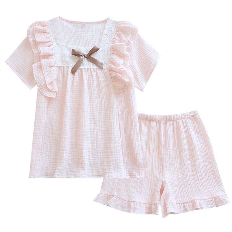 パジャマ 上下セット ガーゼコットン レディース 3色 M-XL 夏用 半袖 半ズボン 部屋着 ルームウェア  25zm1237