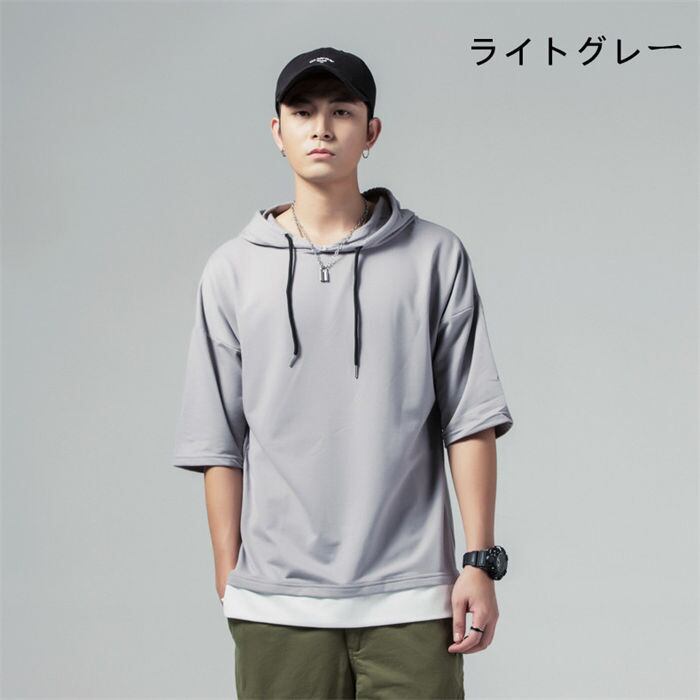 パーカー プルオーバー 五分袖 重ね着風 メンズ 4色 M-5XL トップス カジュアル 無地 カットソー ゆったり 25zm1405