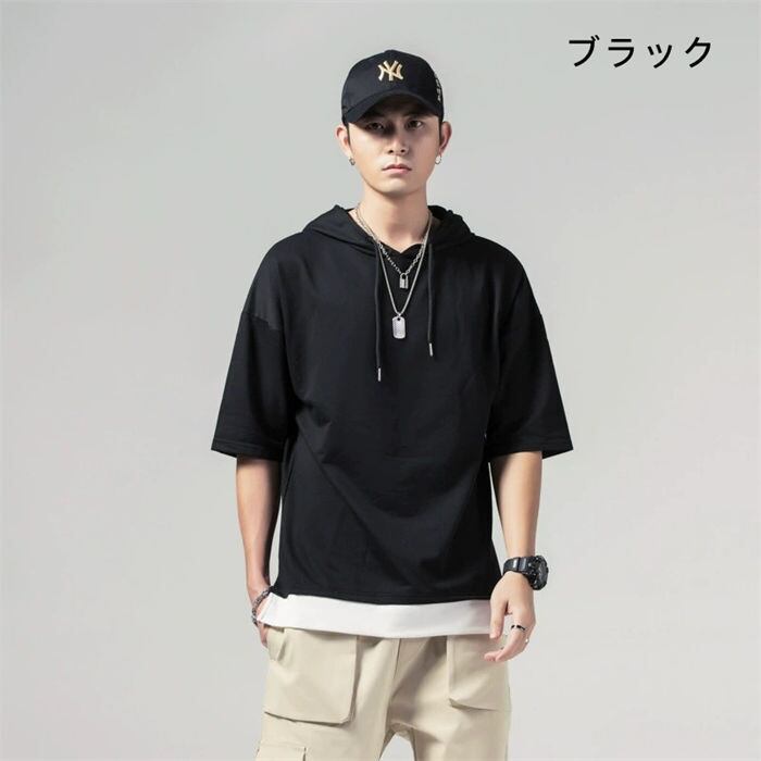 ■商品:パーカー プルオーバー 五分袖 重ね着風 メンズ 4色 M-5XL トップス カジュアル 無地 カットソー ゆったり 韓国 ファッション コーデ おすすめ カジュアル きれいめ 大きいサイズ 人気 ゆったり 20代 30代 40代 50代