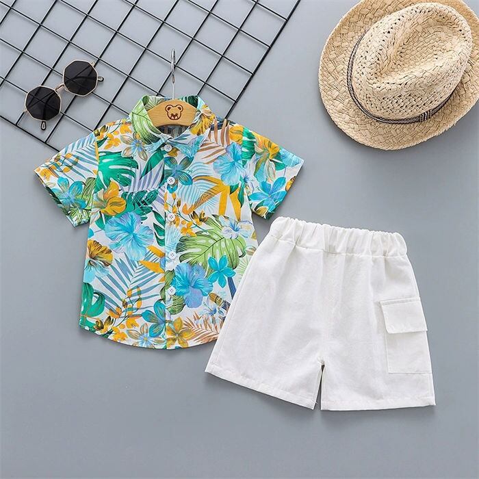 新登場!可愛い花柄のベビー服セットアップが、80から110㎝までのサイズ展開で2色ご用意しました。男の子にぴったりの半袖シャツとショートパンツのコンビネーションで、暑い季節に最適な一着です。