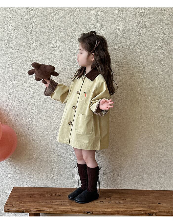 ★特徴:このジャケットカバーオールは、カジュアルでありながらも女の子らしい可愛さを引き立てるカーキ色が魅力です。軽やかな素材で作られているため、気軽に羽織れるライトアウターとして、外出時のスタイルアップに一役買います!遊ぶのが大好きなお子様をしっかりサポートし、自由な動きを妨げません。