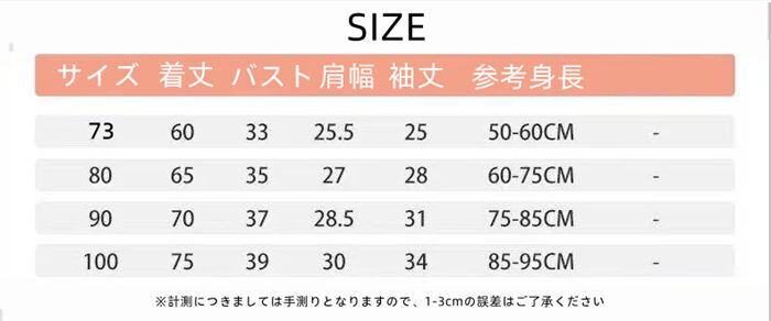 ★特徴:73㎝から100㎝までのサイズ展開と、選べる2色をご用意!裏起毛素材で保温性も抜群、寒さを気にせず遊びに行ける安心感があります。動きやすさを重視した設計で、家の中でも外出時でも活躍すること間違いなしです。可愛いデザインが、お子様の魅力を一層引き立てます。