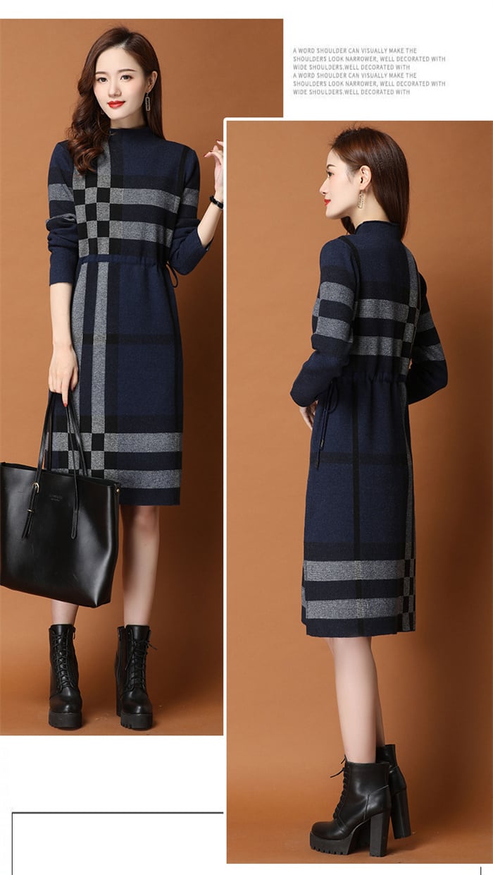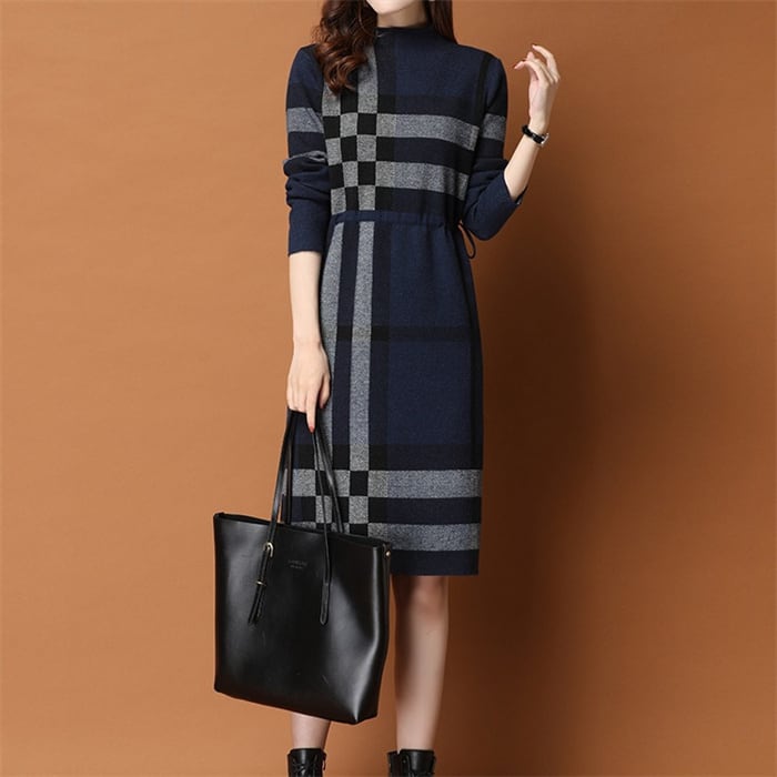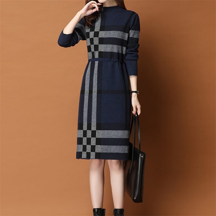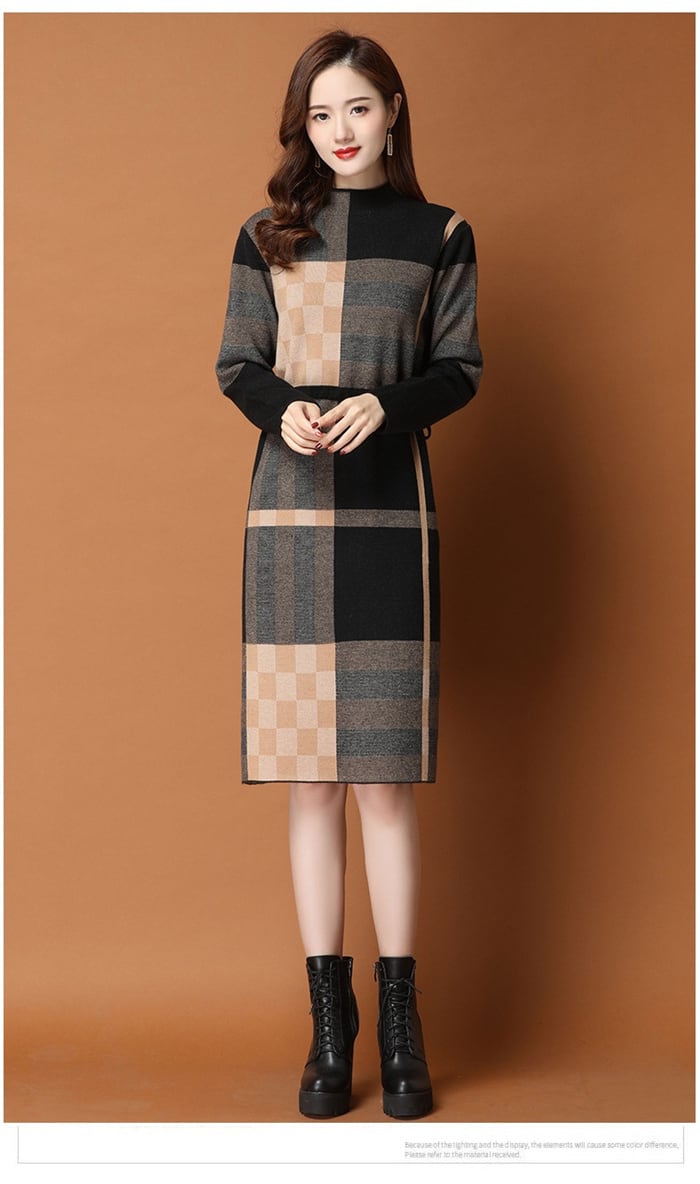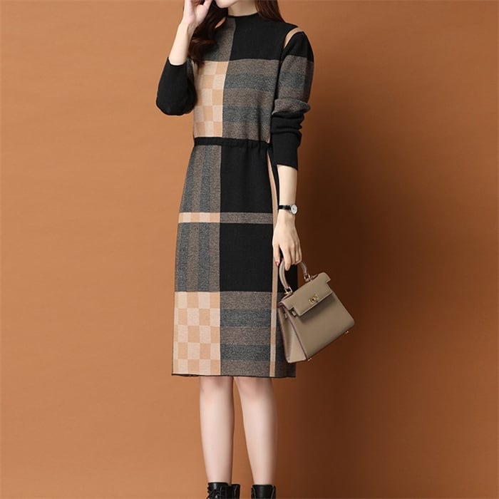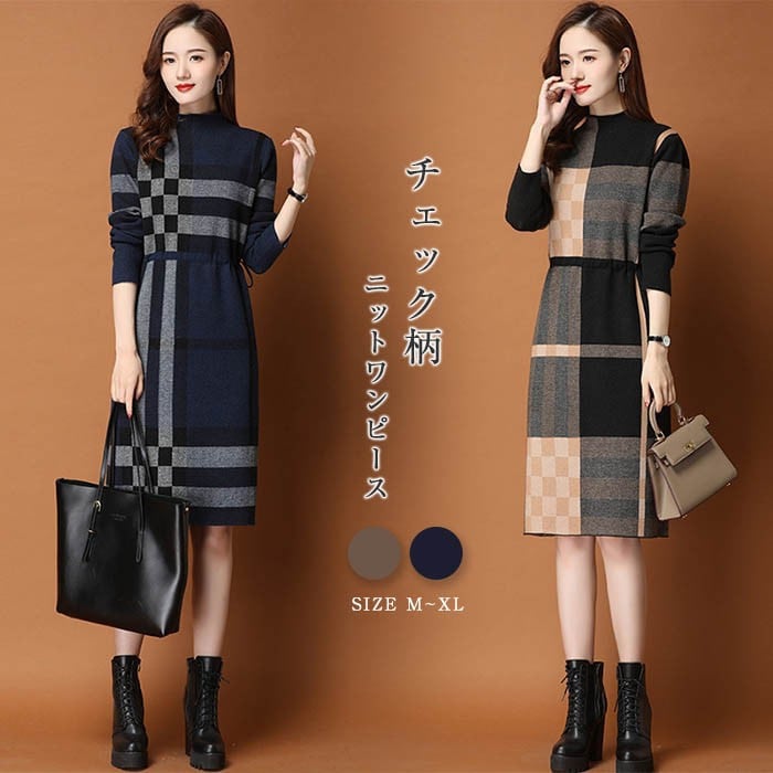 ニットワンピース 長袖 レディース 2色 S-2XL ハイネック ひざ丈 上品 チェック柄 おしゃれ 秋冬 25zm2068