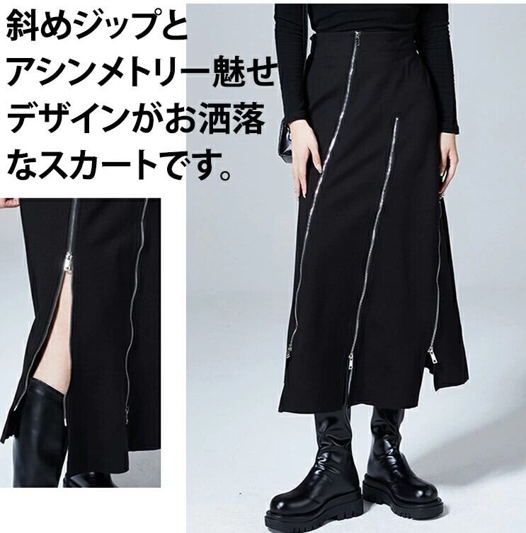 ■商品:スカート アシンメトリー 斜めジップ レディース 黒 M-2L ロング丈 スリット モード系 個性的 韓国 ファッション コーデ おすすめ カジュアル きれいめ 大きいサイズ 人気 ゆったり 20代 30代 40代 50代