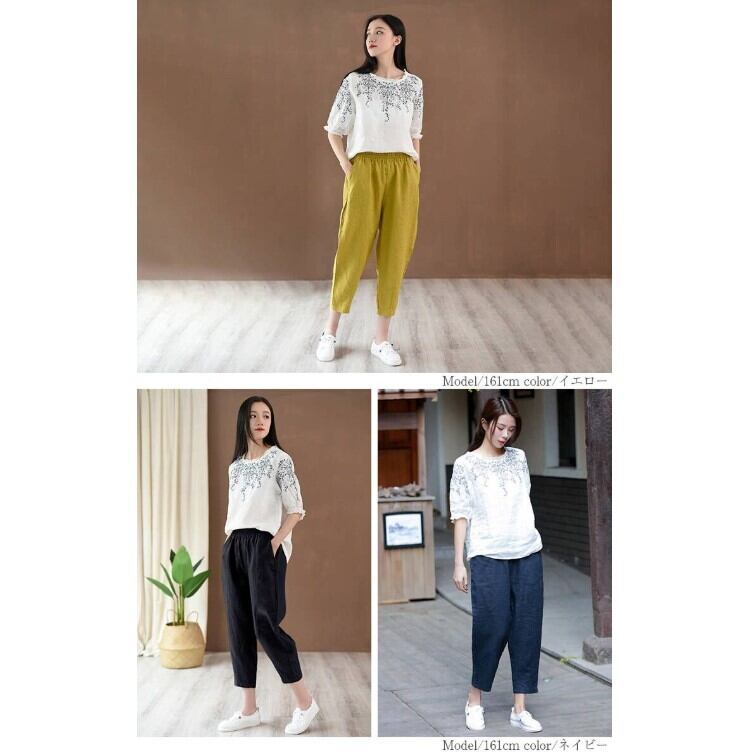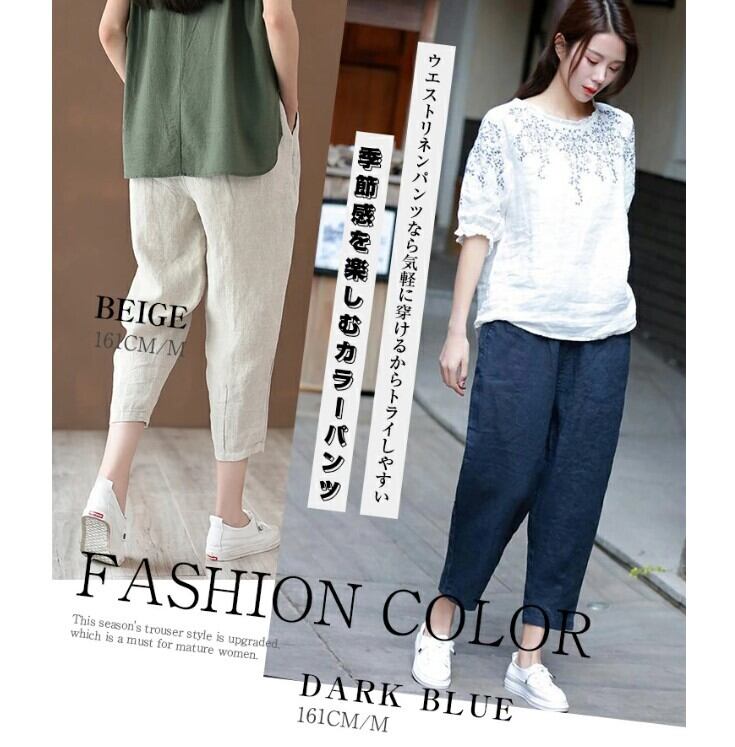 テイパードパンツ リネンパンツ 9分丈 レディース 5色 S-L 綿麻パンツ ウエストゴム リラックスパンツ 25LT199