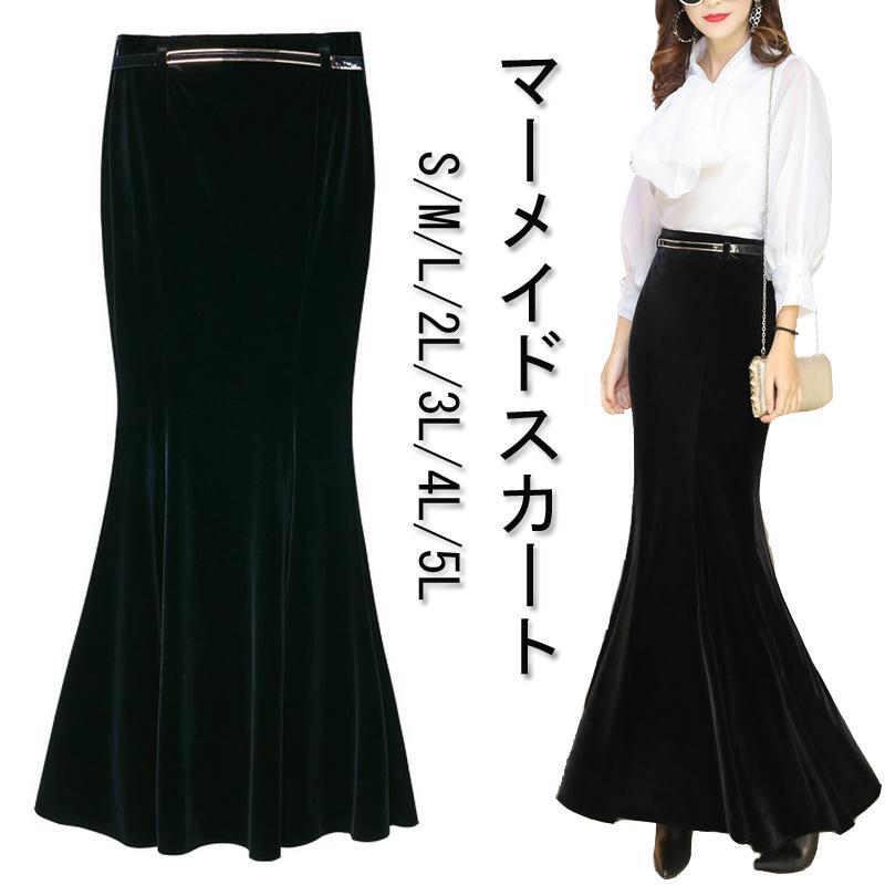 マーメイドスカート ベロア マキシ丈 レディース 黒 S-4L 無地 ロングスカート フレア 25LT212