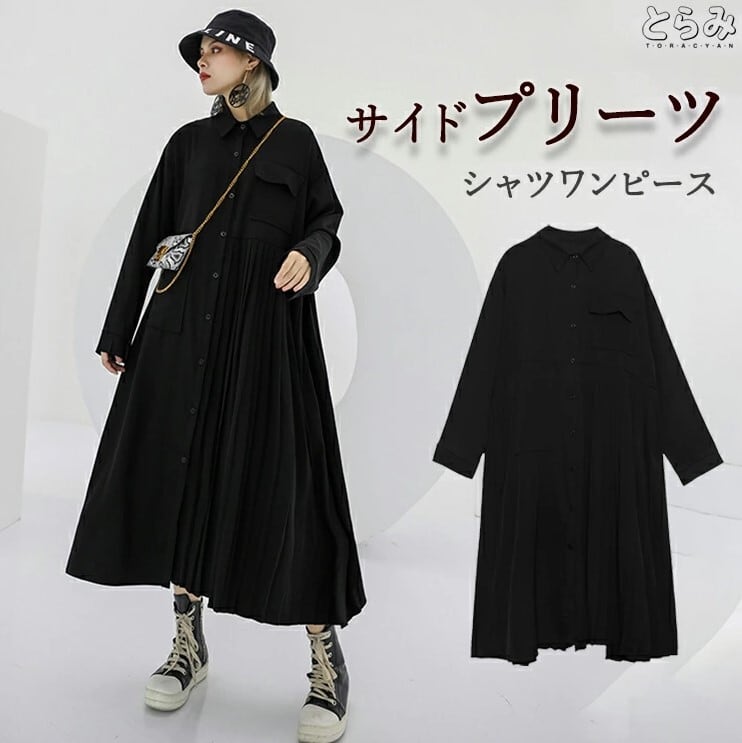 シャツワンピース プリーツワンピース レディース フリーサイズ 無地 ゆったり マキシ丈 アシンメトリー 25LT235