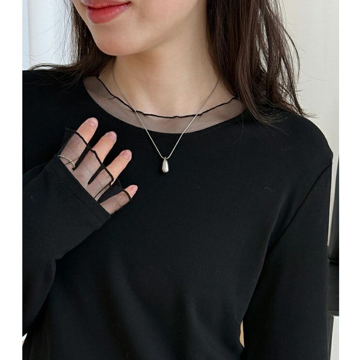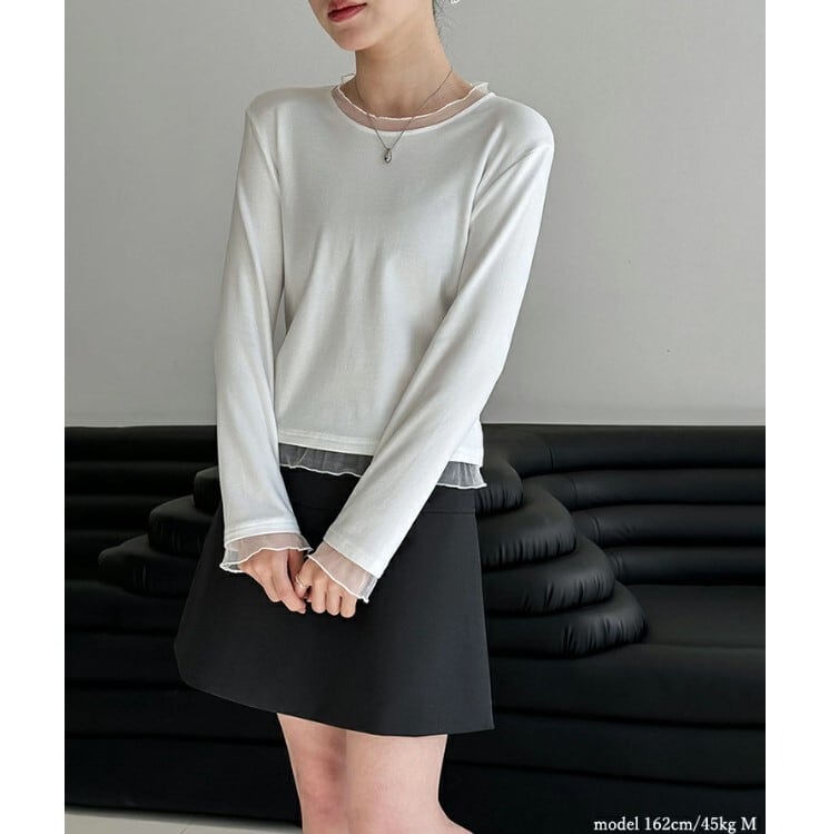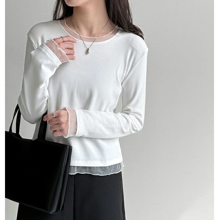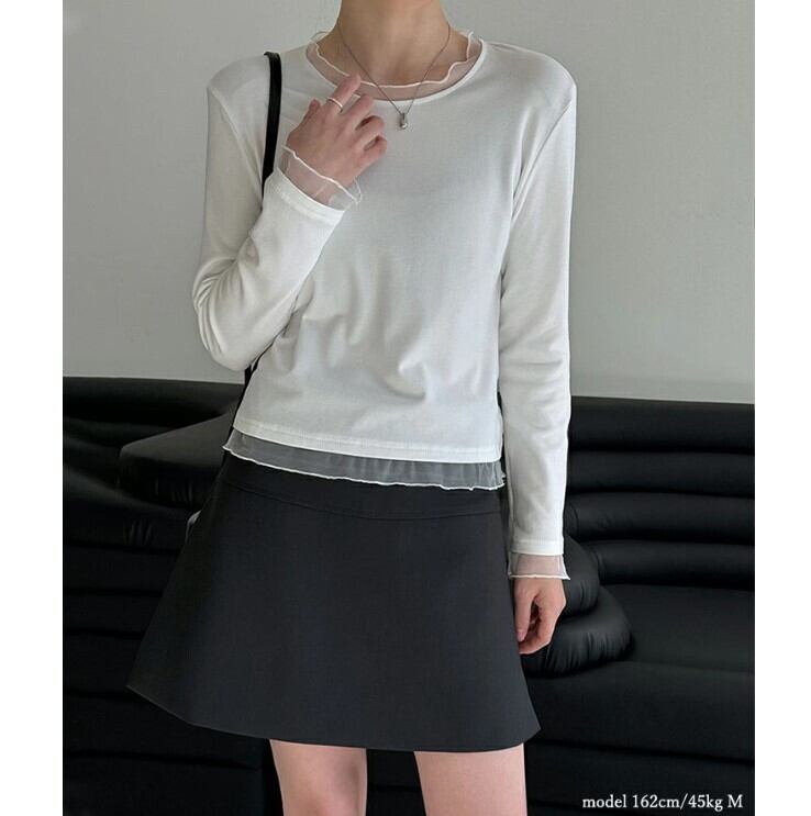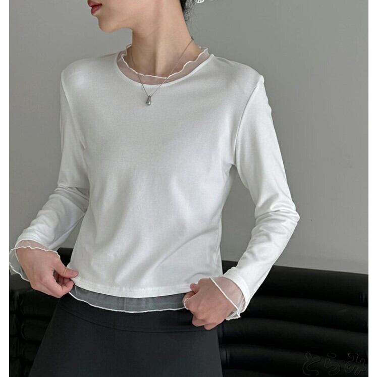 カットソー レース切り替え 長袖 レディース 2色 M-L フリル 重ね着 インナー オフィス カジュアル 26LT05