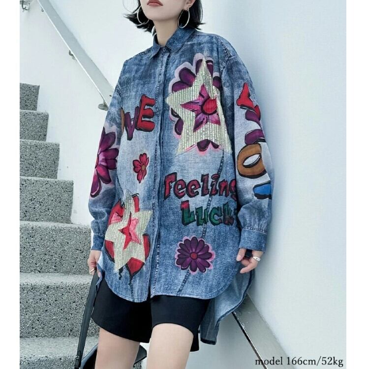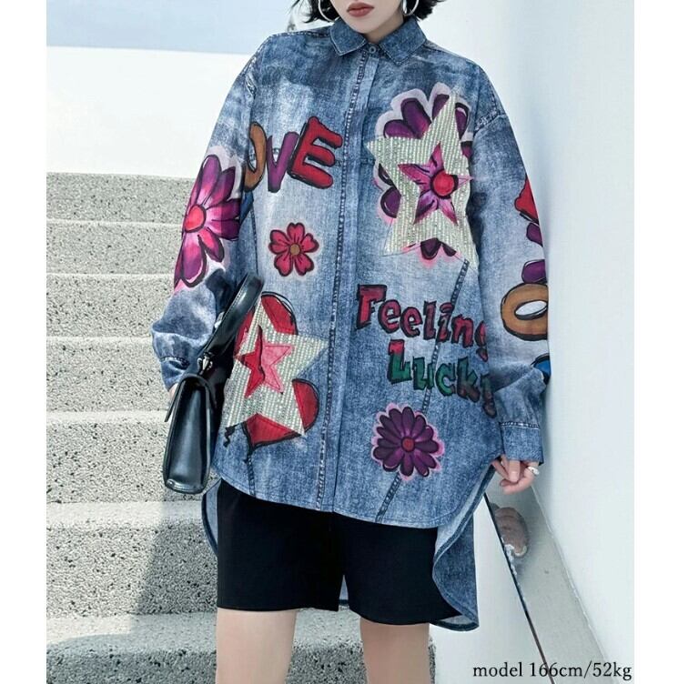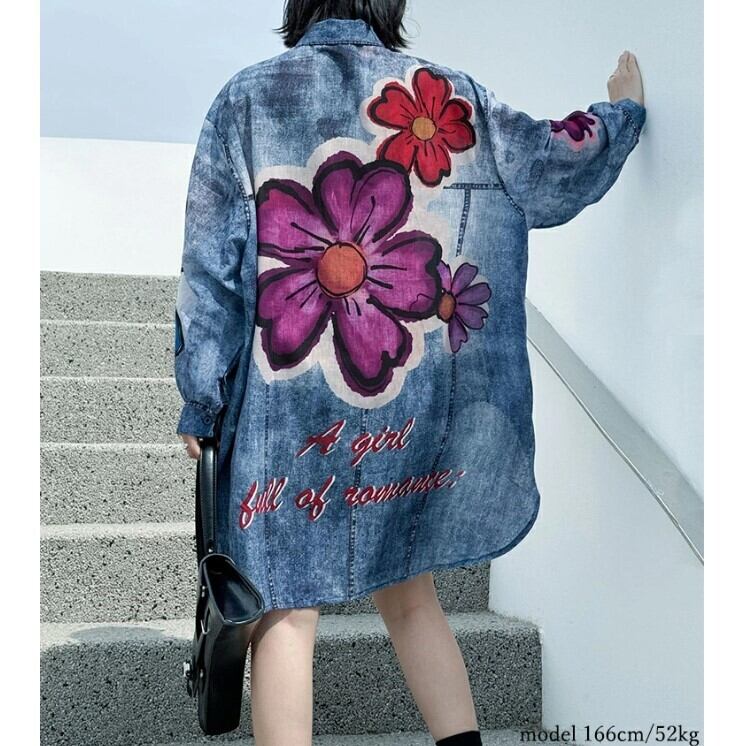 デニムシャツ ロングシャツ レディース 2色 フリーサイズ 個性的 花柄 ヘムデザイン カジュアル 26LT26