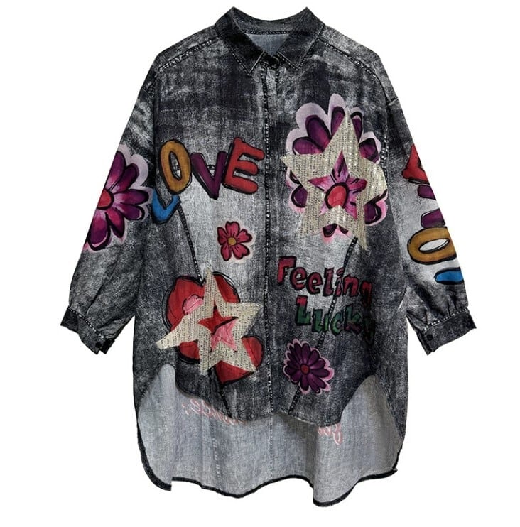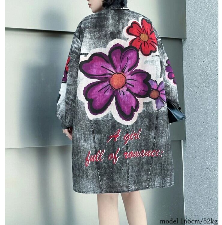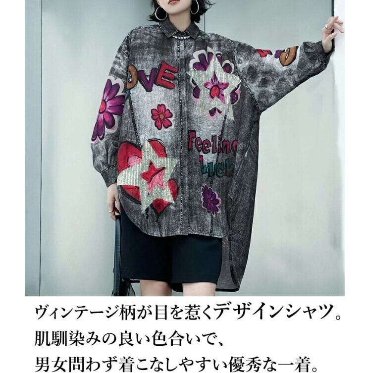 ★特徴:『このデニムシャツは、個性的な花柄とヘムデザインが絶妙に組み合わさった、スタイリッシュなロングシャツです!フリーサイズなので、様々な体型の方にフィットしやすく、カジュアルなコーディネートを楽しむことができます。』