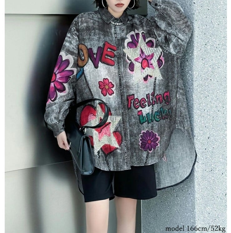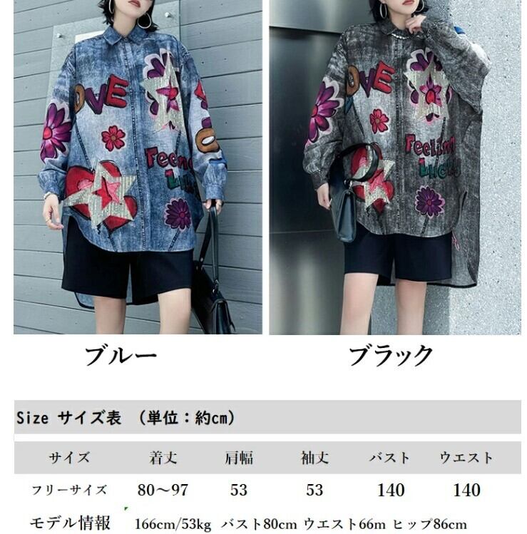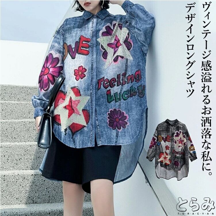 ■商品:デニムシャツ ロングシャツ レディース 2色 フリーサイズ 個性的 花柄 ヘムデザイン カジュアル 韓国 ファッション コーデ おすすめ カジュアル きれいめ 大きいサイズ 人気 ゆったり 20代 30代 40代 50代
