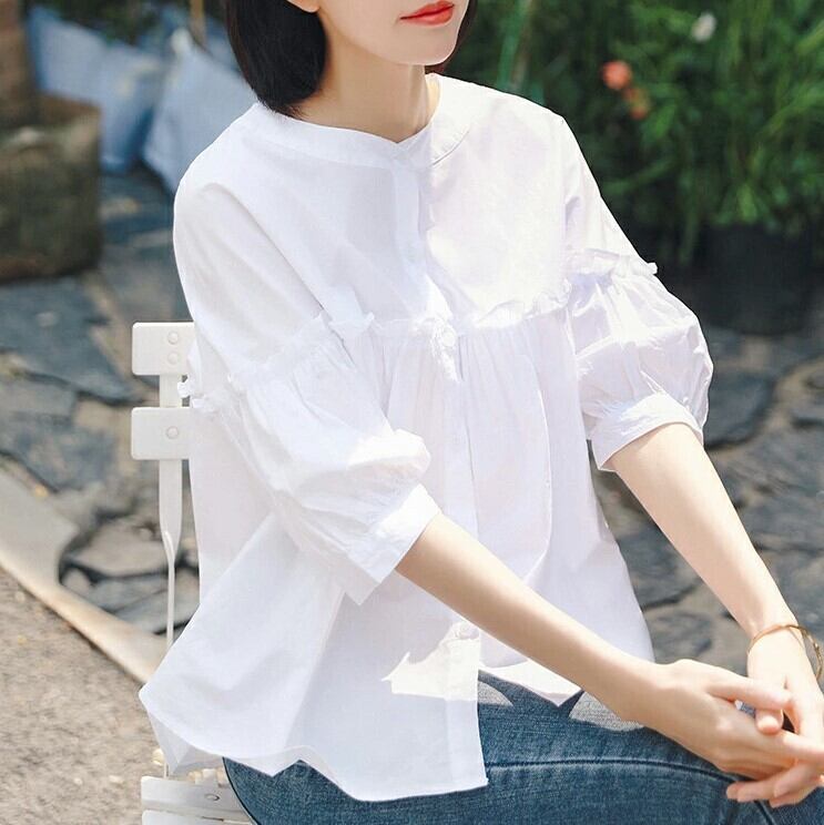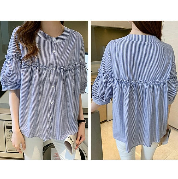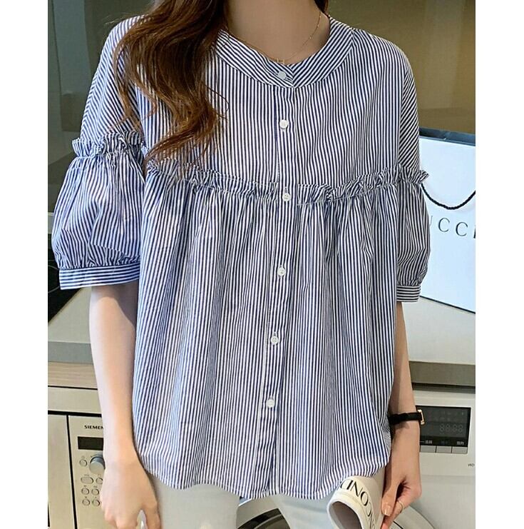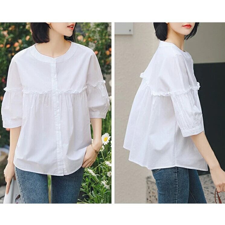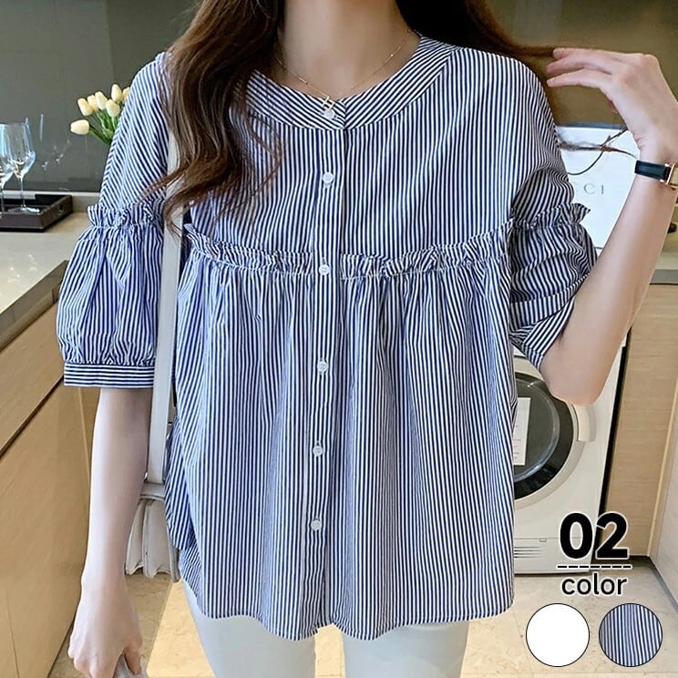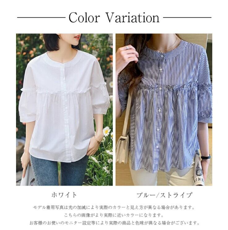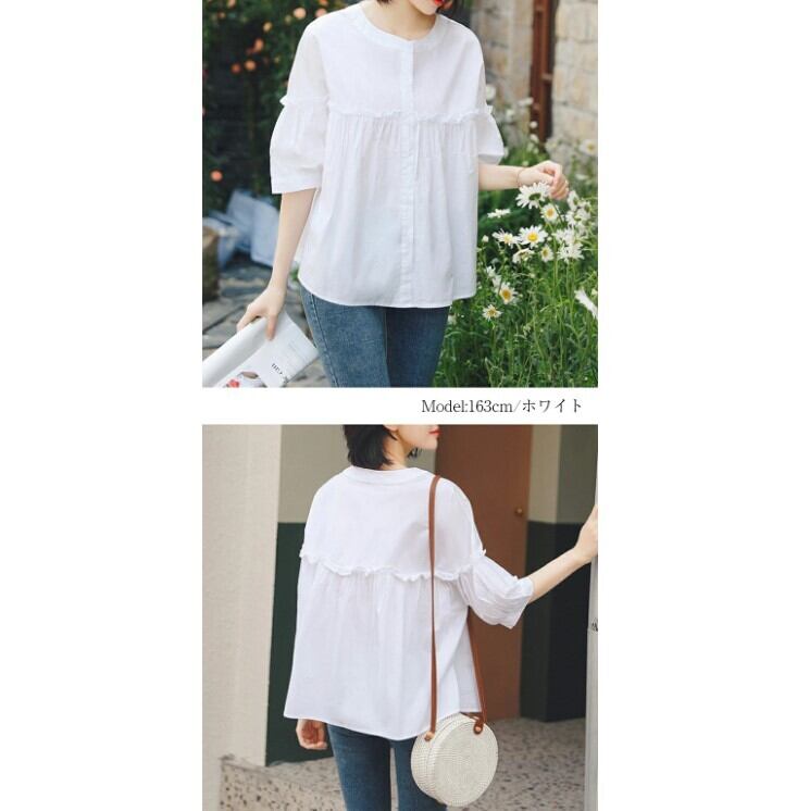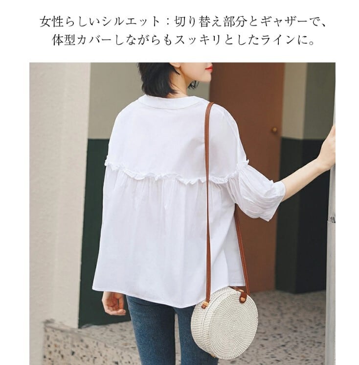 ■商品:ブラウス 半袖 五分袖 レディース 2色 M-3L 9分丈 ボリューム袖 切り替えギャザー フリル 韓国 ファッション コーデ おすすめ カジュアル きれいめ 大きいサイズ 人気 ゆったり 20代 30代 40代 50代