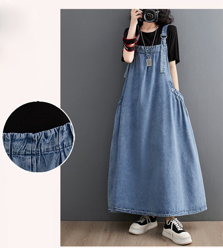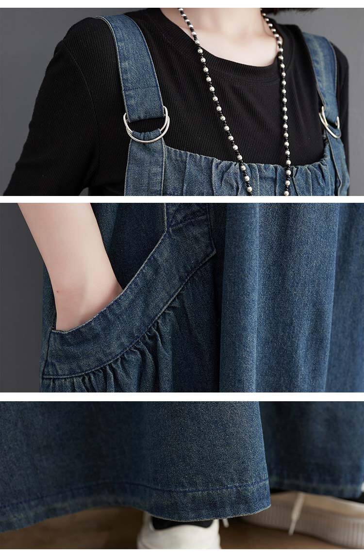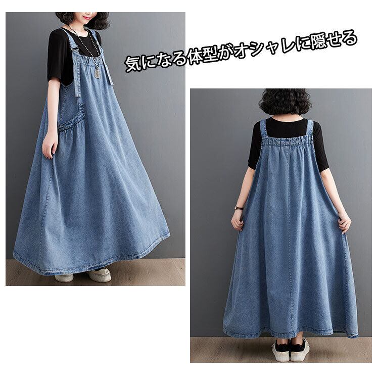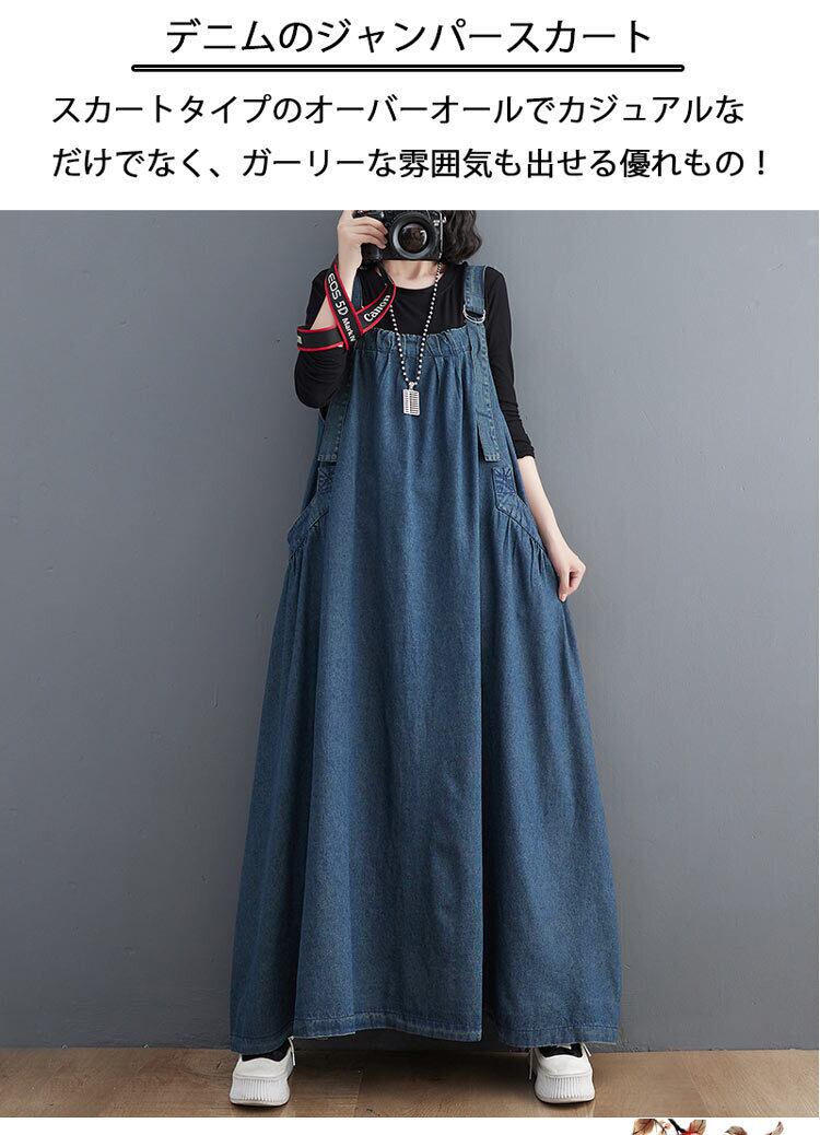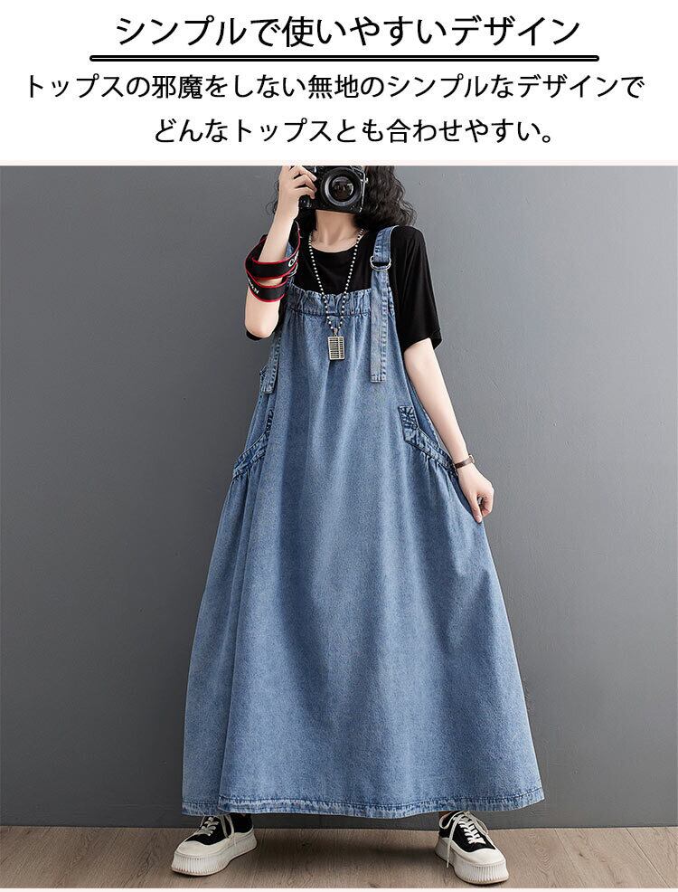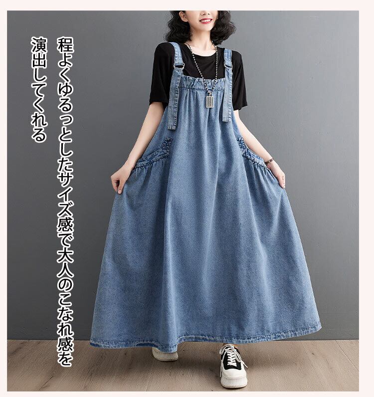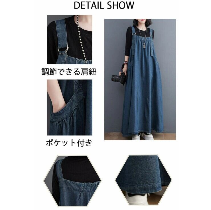『こちらのデニムワンピースは、サロペットデザインがポイントで、重ね着やカジュアルなスタイルにぴったり。MからXLまでのサイズ展開は、幅広い体型に対応しているため、気軽にお楽しみいただけます。このアイテムを着て、あなたのスタイルに新たな魅力をプラスしてみませんか!』