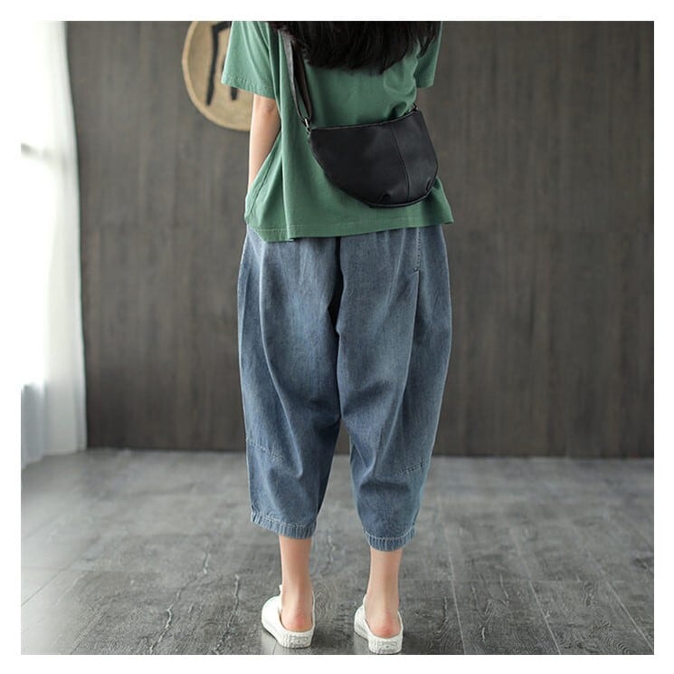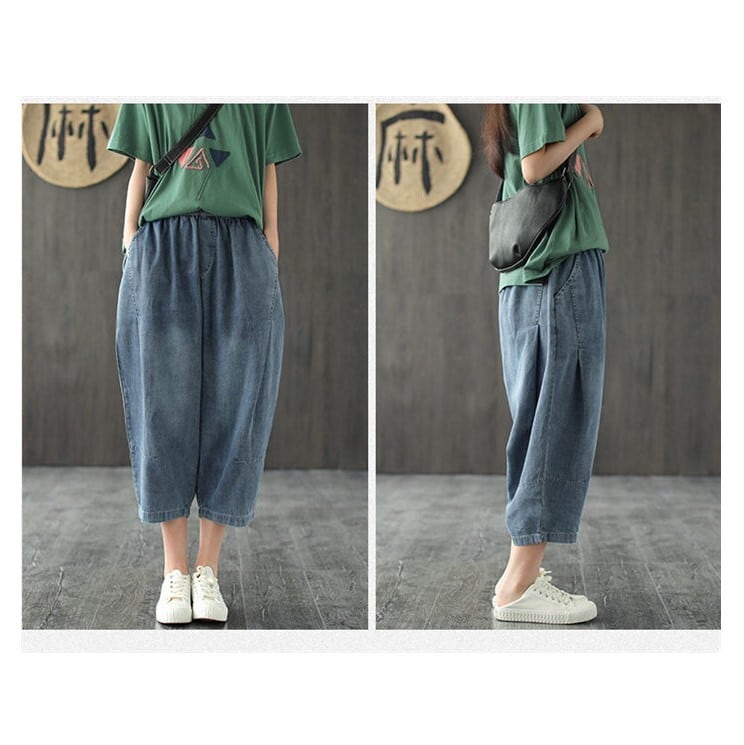デニムパンツ サルエルパンツ ワイド 7分丈 レディース ブルー M-L ゆったり 薄手 カジュアル 26LT70