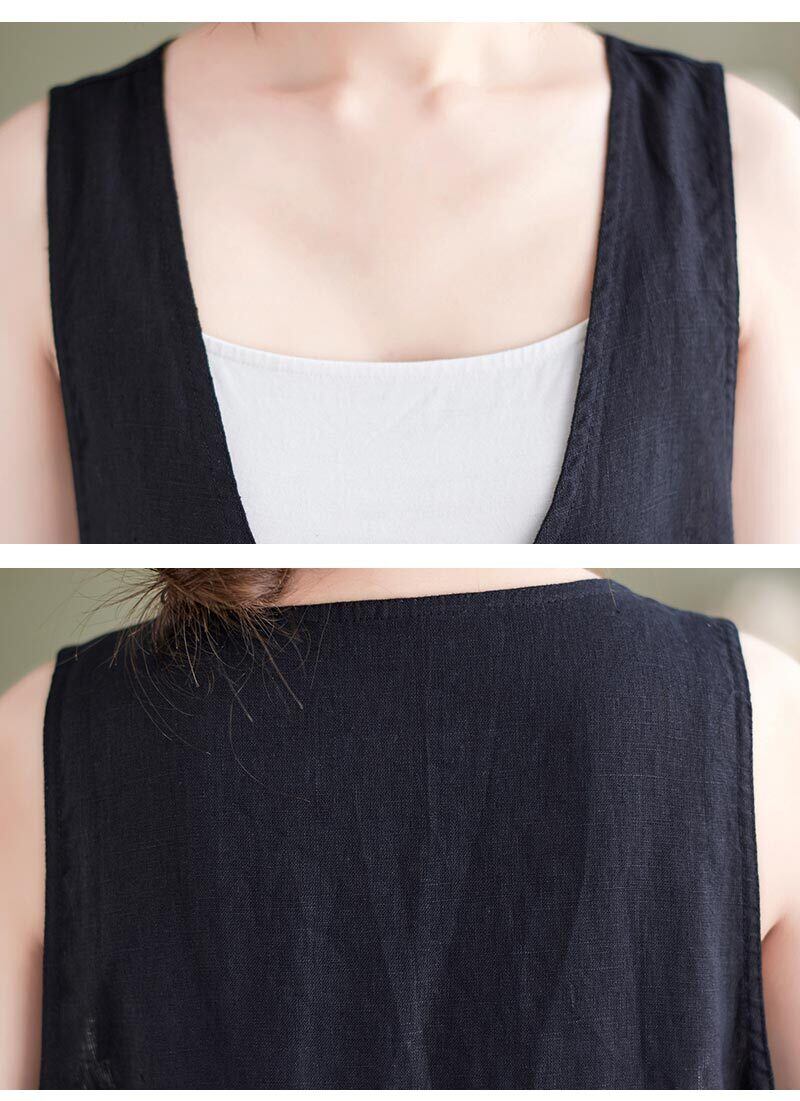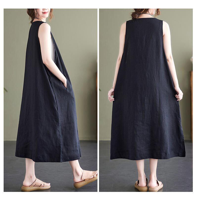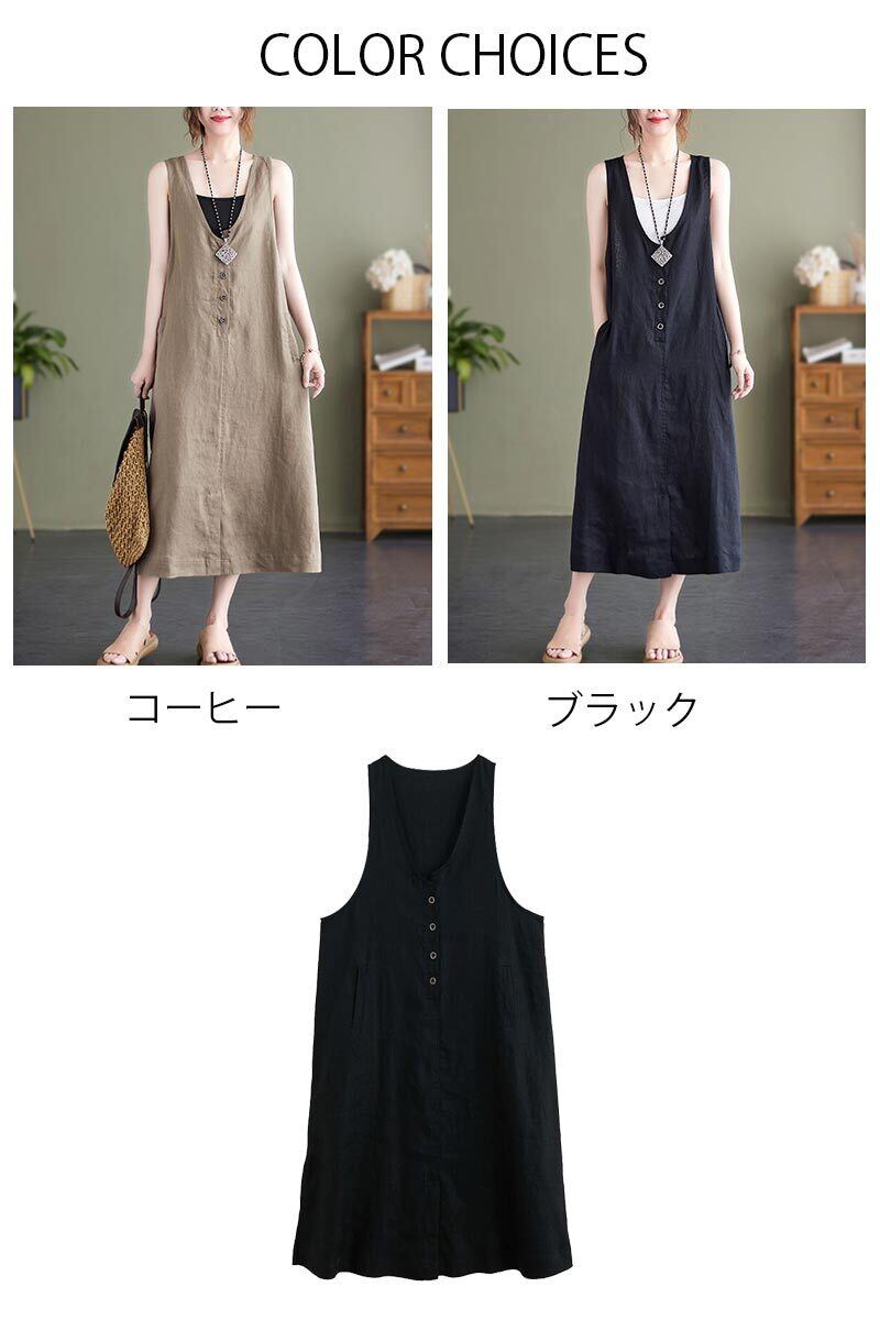 ジャンパースカート ロングワンピース 綿麻 レディース 2色 M-2XL 無地 Vネック Aライン カジュアル 26LT76