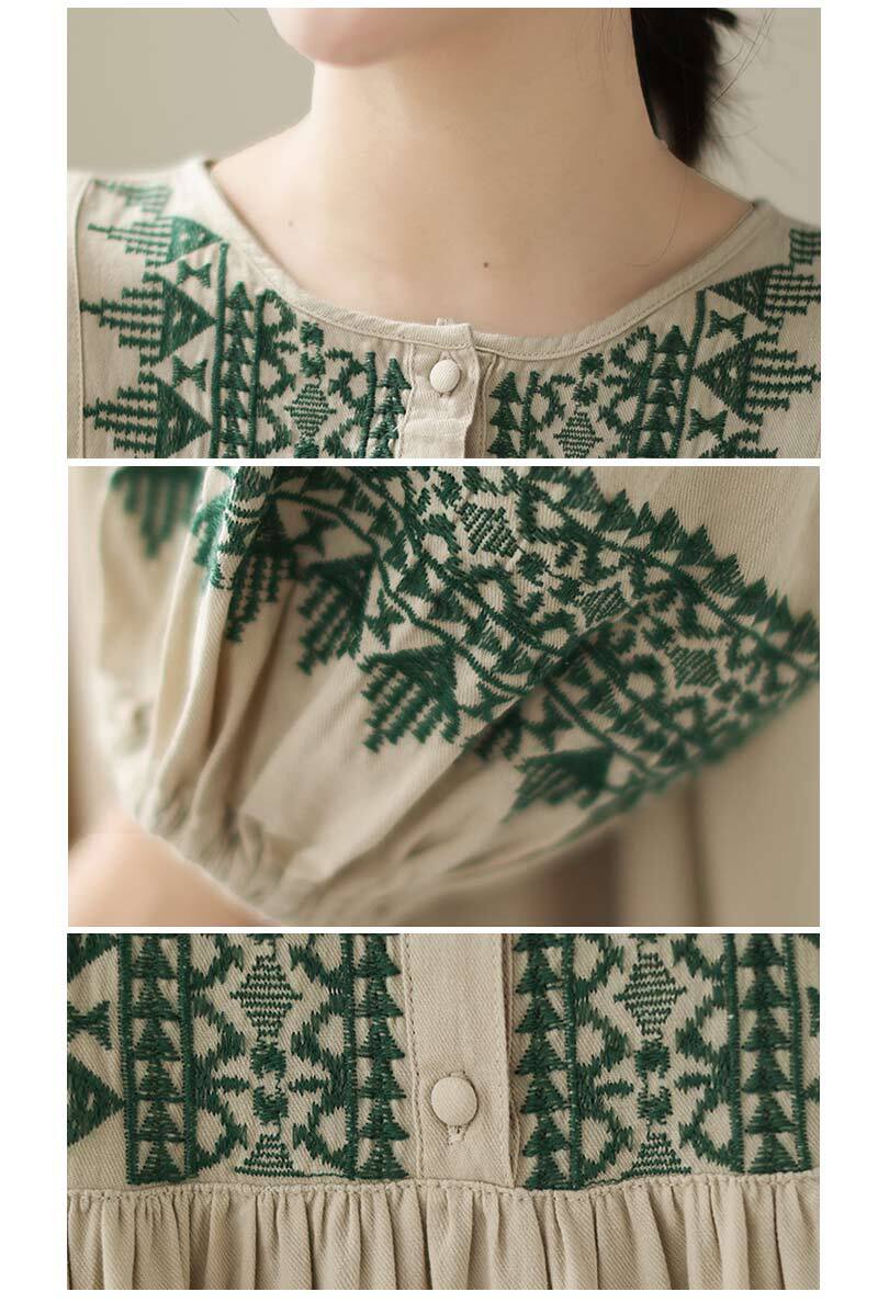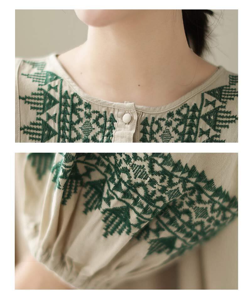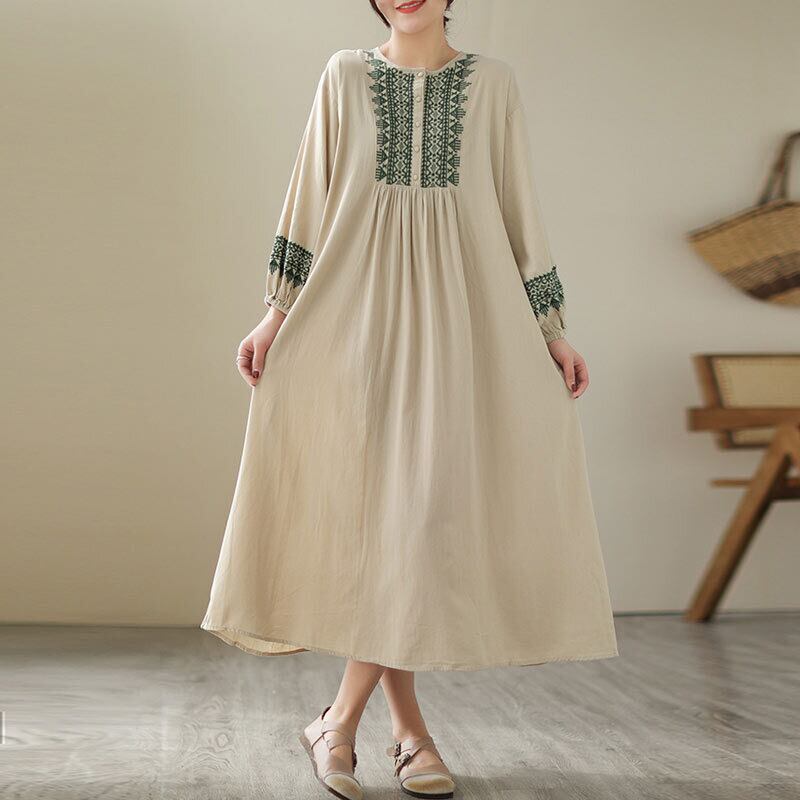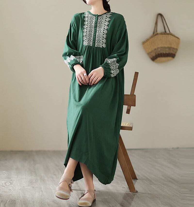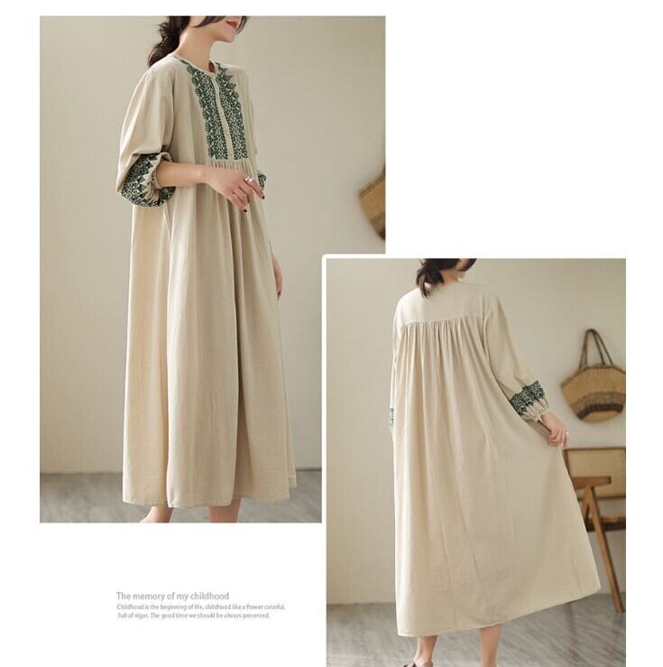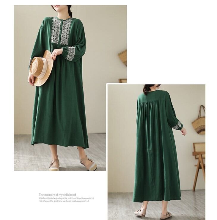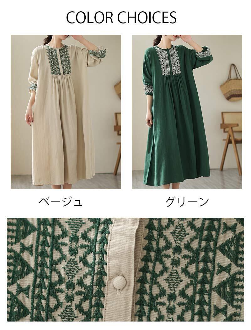 ワンピース 綿麻 長袖 レディース 2色 M-2XL ロングワンピース 刺繍 パフスリーブ Aライン 民族調 カジュアル 26LT81