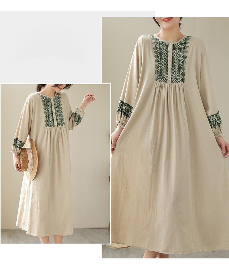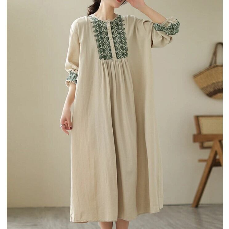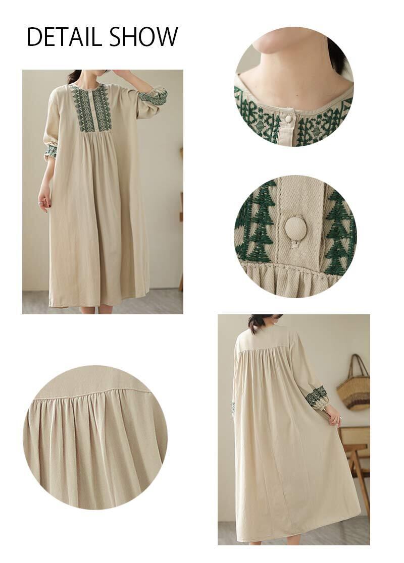 ■商品:ワンピース 綿麻 長袖 レディース 2色 M-2XL ロングワンピース 刺繍 パフスリーブ Aライン カジュアル 韓国 ファッション コーデ おすすめ カジュアル きれいめ 大きいサイズ 人気 ゆったり 20代 30代 40代 50代