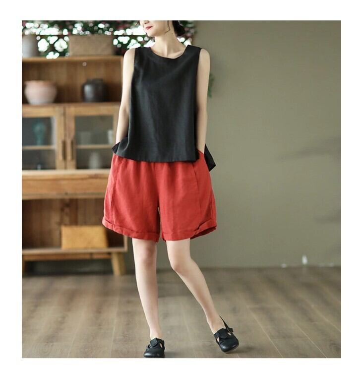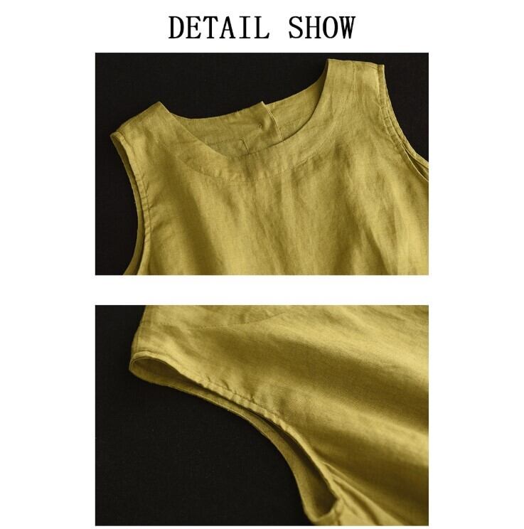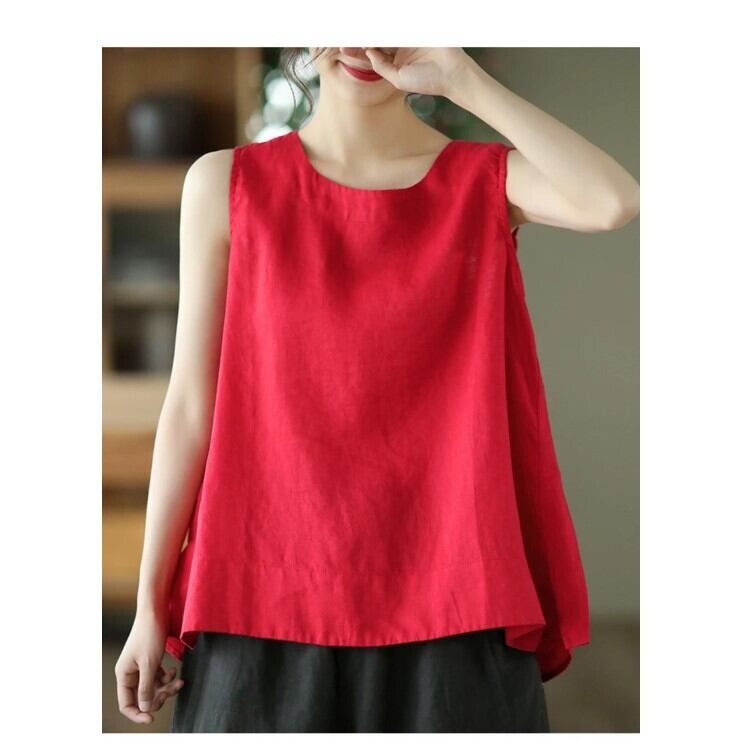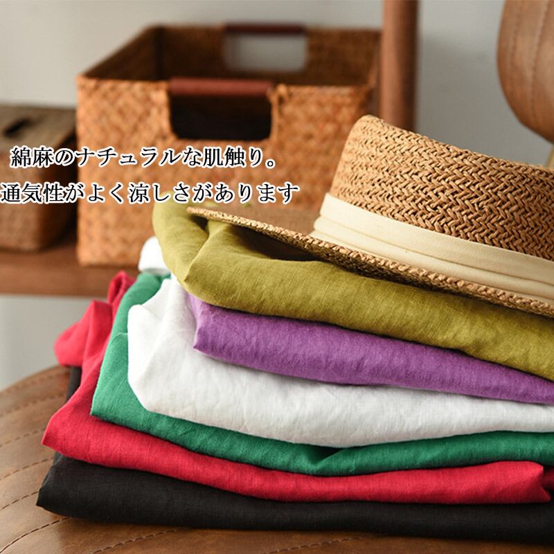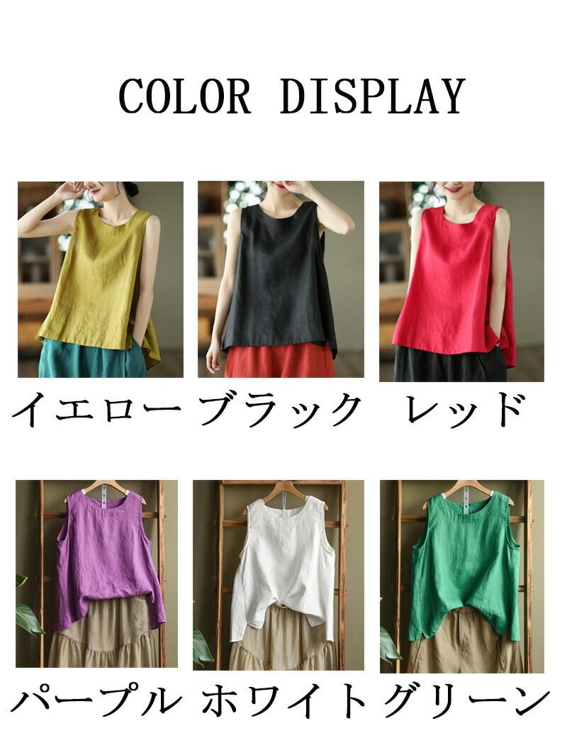 ノースリーブトップス 綿麻 レディース 6色 M-2XL フレア ラウンドネック 無地 ショート丈 夏 カジュアル 26LT87