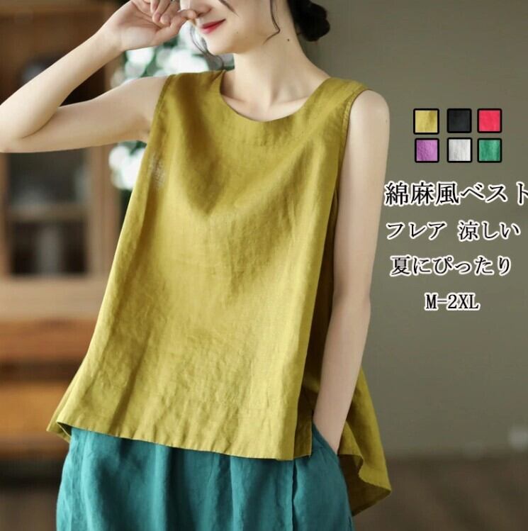 ■商品:ノースリーブトップス 綿麻 レディース 6色 M-2XL フレア ラウンドネック 無地 ショート丈 夏 カジュアル 韓国 ファッション コーデ おすすめ カジュアル きれいめ 大きいサイズ 人気 ゆったり 20代 30代 40代 50代