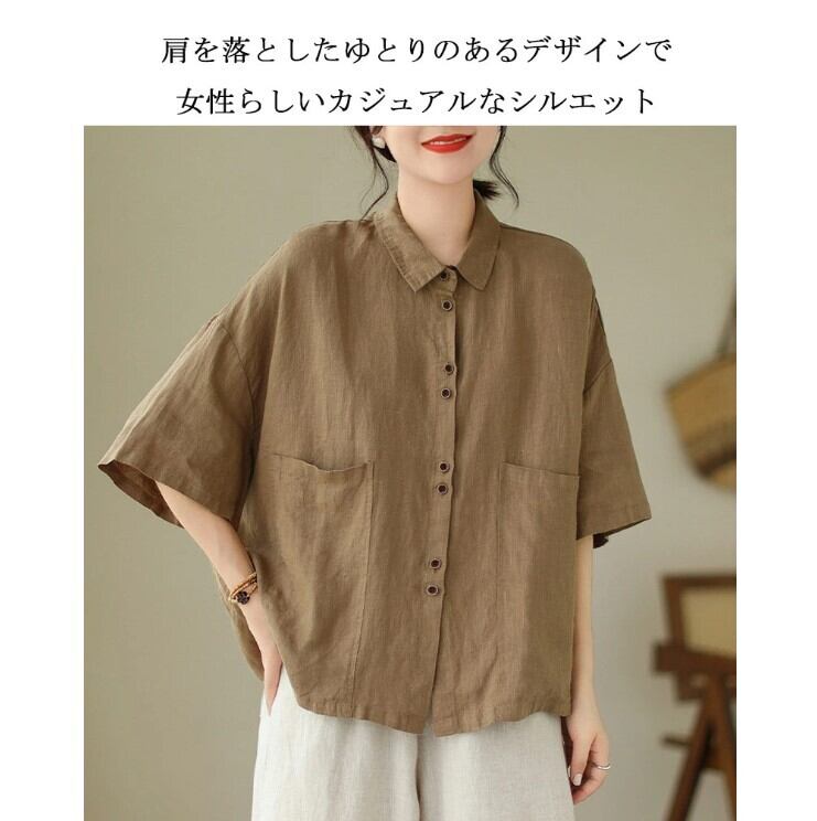 シャツ 半袖 綿麻 半袖シャツ レディース 3色 M-2XL 無地 ゆったり ブラウス 夏 カジュアル 26LT93