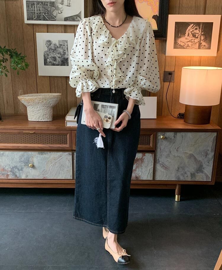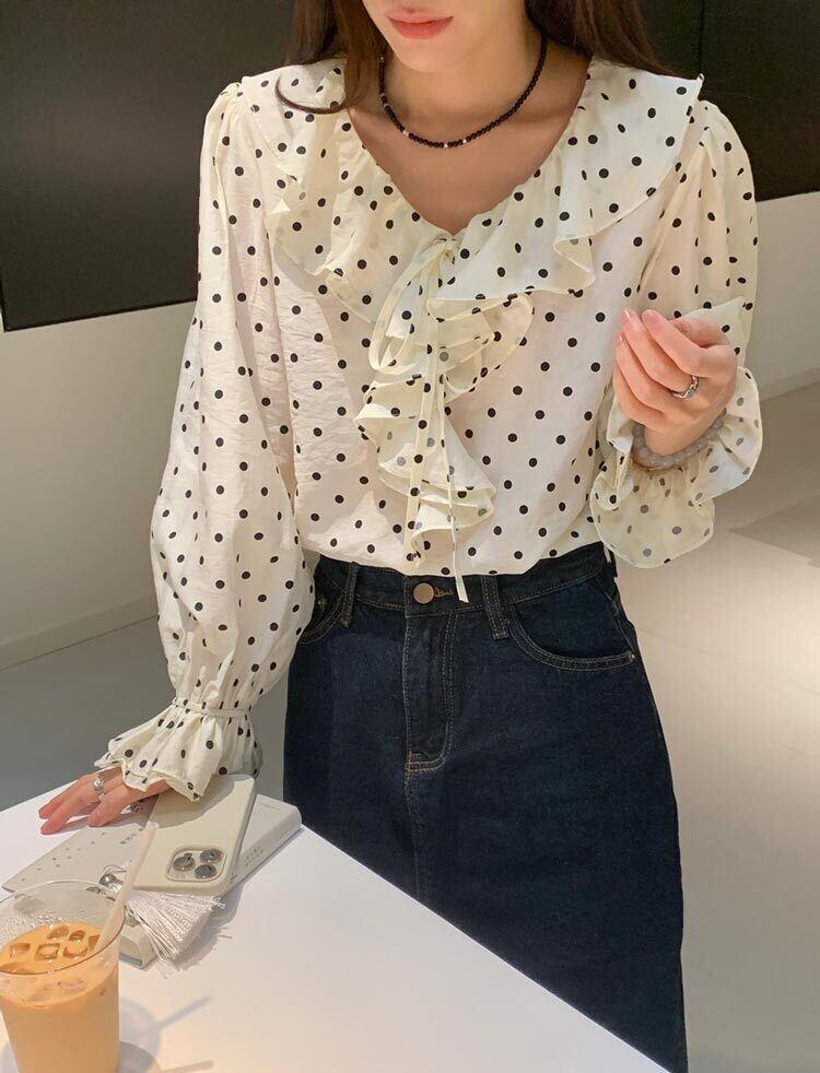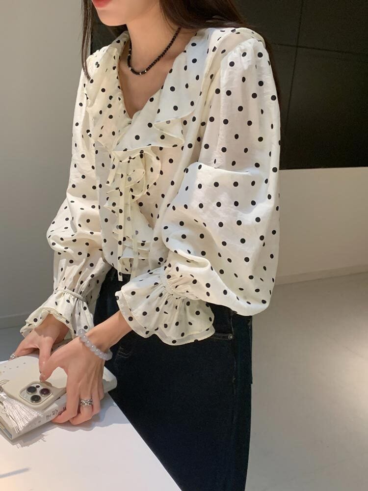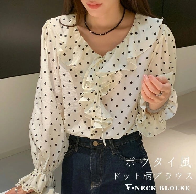 ■商品:シャツ ブラウス 長袖 レディース フリーサイズ バルーンスリーブ ドット柄 Vネック オフィス カジュアル 韓国 ファッション コーデ おすすめ カジュアル きれいめ 大きいサイズ 人気 ゆったり 20代 30代 40代 50代