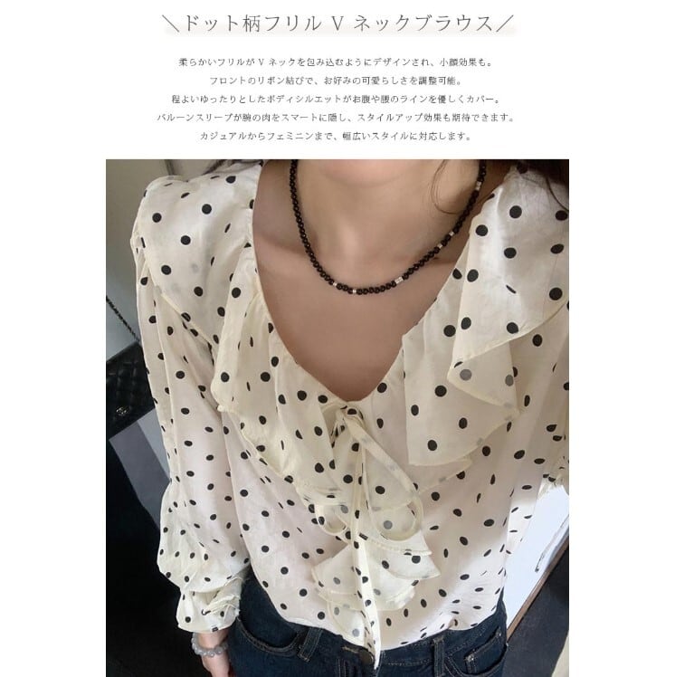 ★特徴:このバルーンスリーブブラウスは、オフィスでもカジュアルシーンでも活躍する魅力的なアイテムです!フリーサイズで、どんな体型の方でも心地よく着用できるデザインが特徴です。ドット柄がキュートさを演出しながら、Vネックがスッキリとした印象を与えます。長袖仕様で、春秋シーズンのスタイリングにぴったりです!
