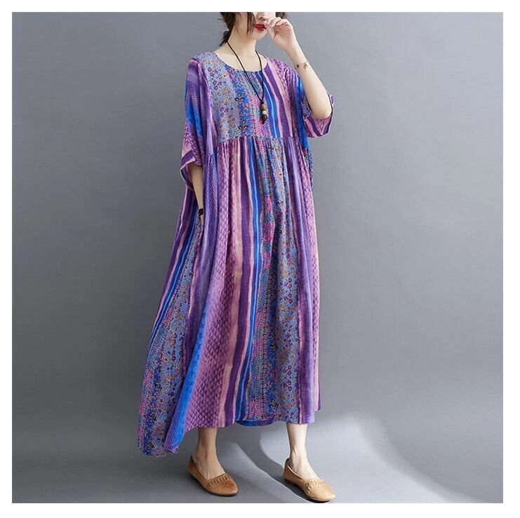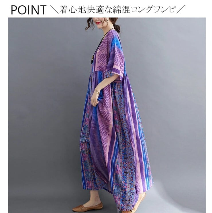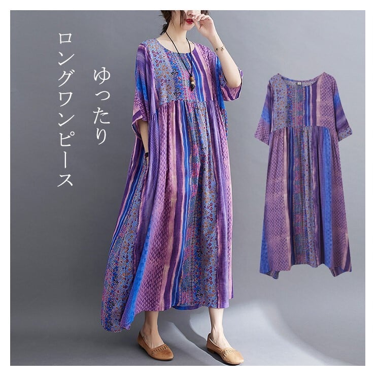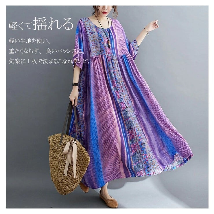 エスニックワンピース 半袖 レディース 3色 フリーサイズ ゆったり 綿麻 リゾート カジュアル 26LT127