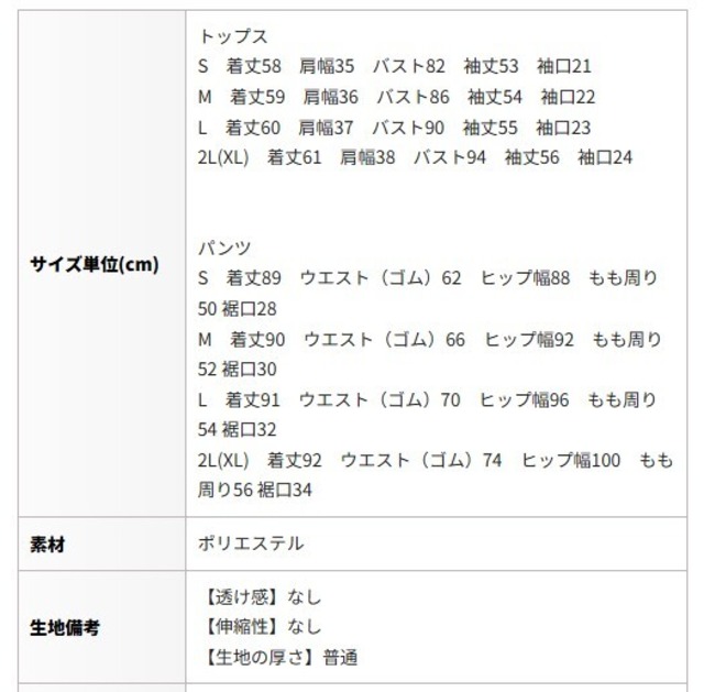 2L(XL) 着丈92 ウエスト(ゴム)74 ヒップ幅100 もも周り56 裾口34
