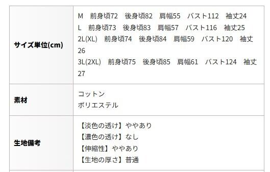 3L(2XL) 前身頃75 後身頃85 肩幅61 バスト124 袖丈27