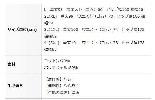 2L(XL) 着丈99 ウエスト(ゴム)70 ヒップ幅166 裾幅59