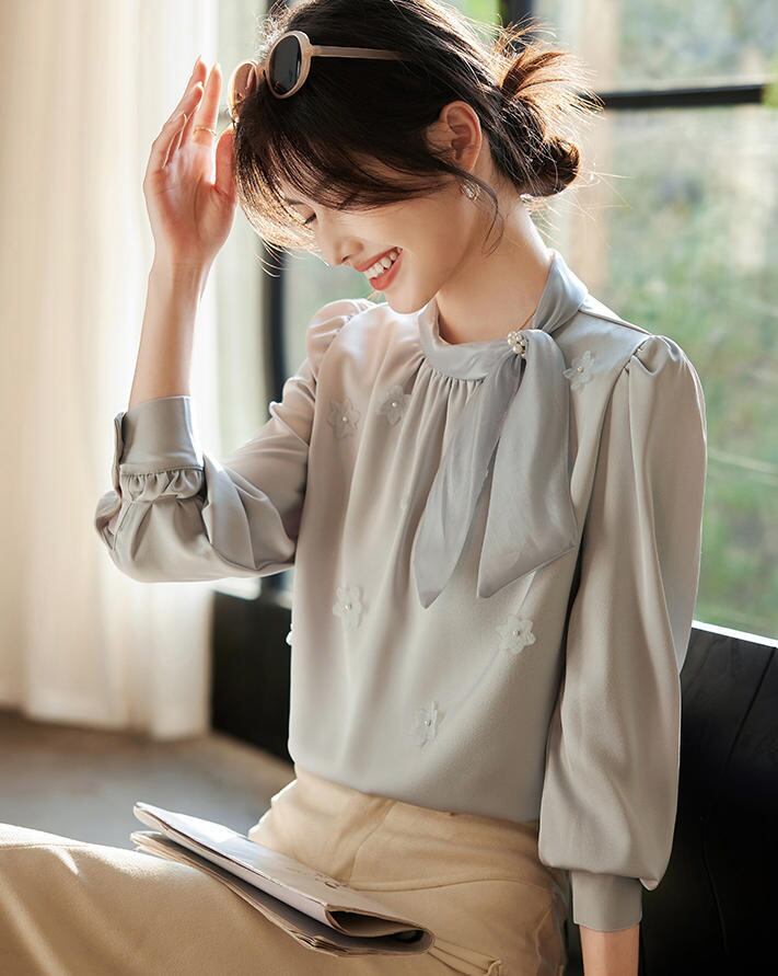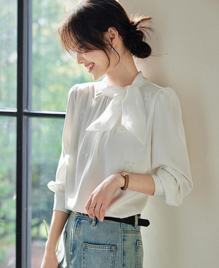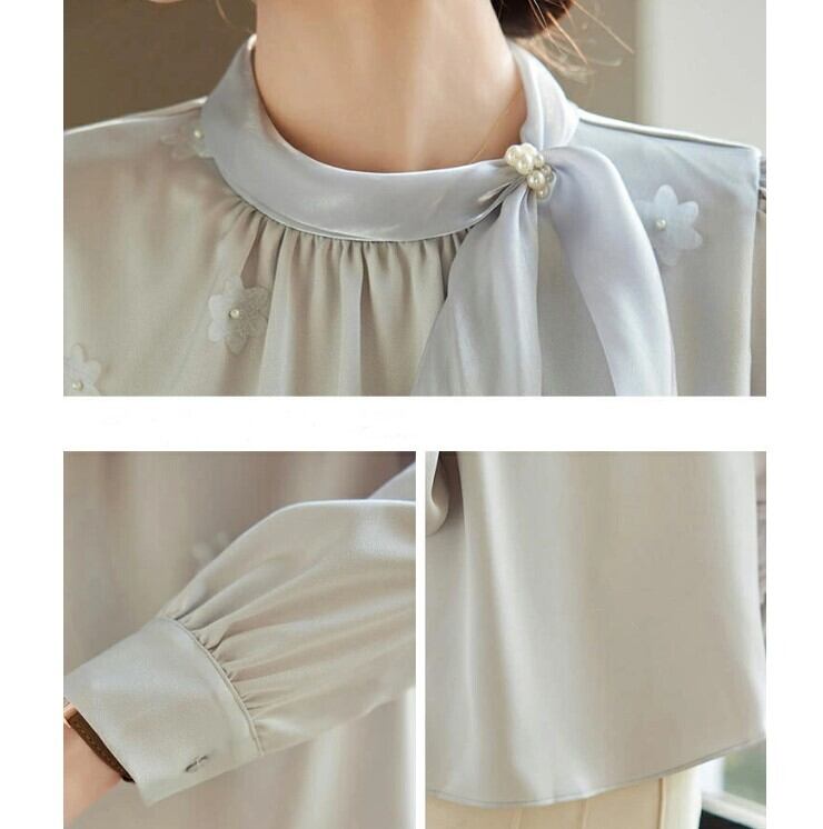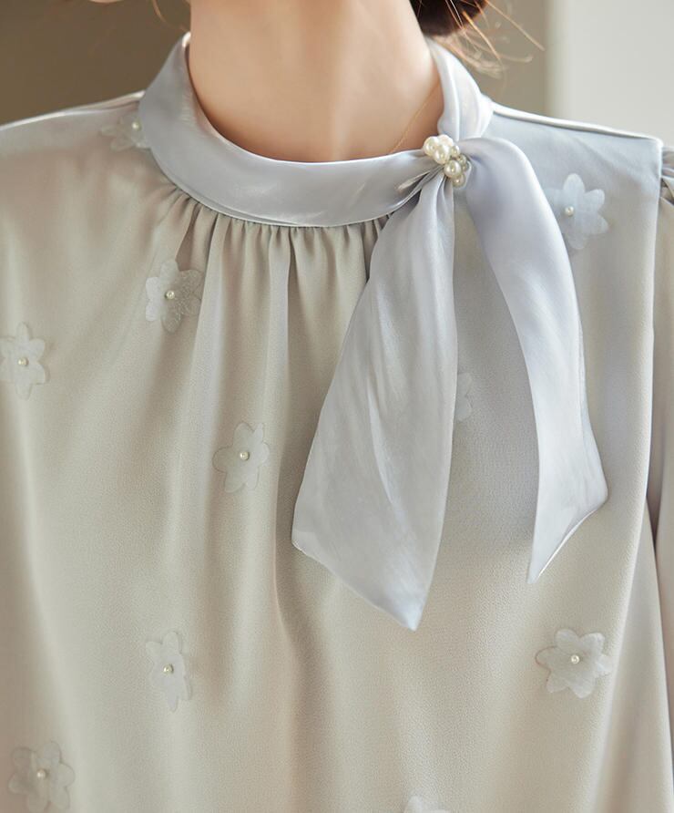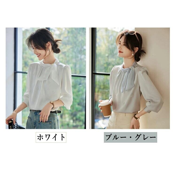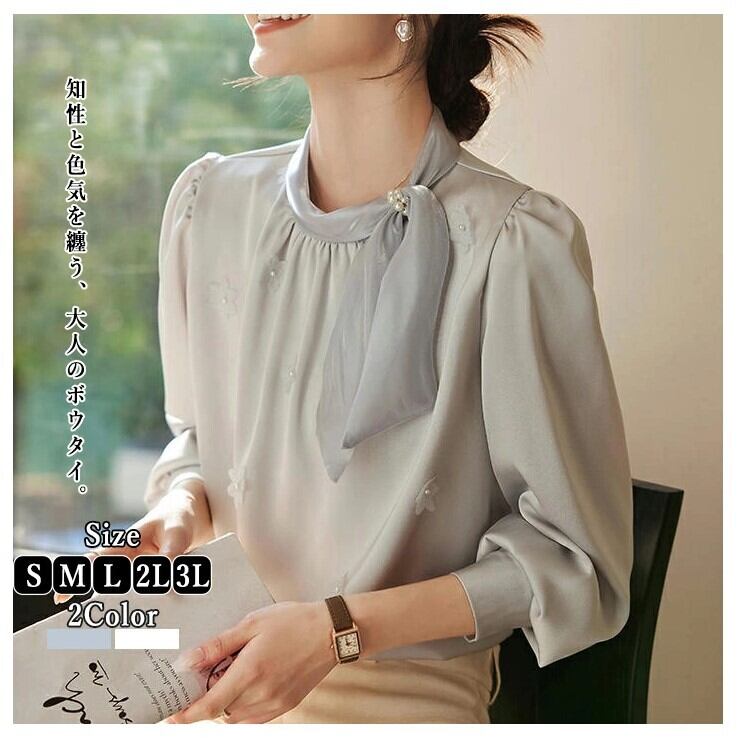■商品:ブラウス ボウタイ 長袖 サテン レディース 2色 S-3L パール 上品 オフィス フォーマル 韓国 ファッション コーデ おすすめ カジュアル きれいめ 大きいサイズ 人気 ゆったり 20代 30代 40代 50代
