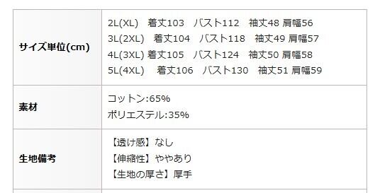 5L(4XL) 着丈106 バスト130 袖丈51 肩幅59