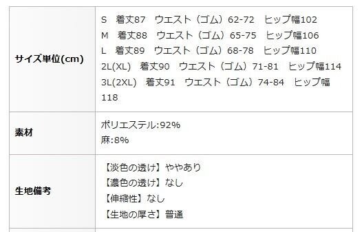 3L(2XL) 着丈91 ウエスト(ゴム)74-84 ヒップ幅118