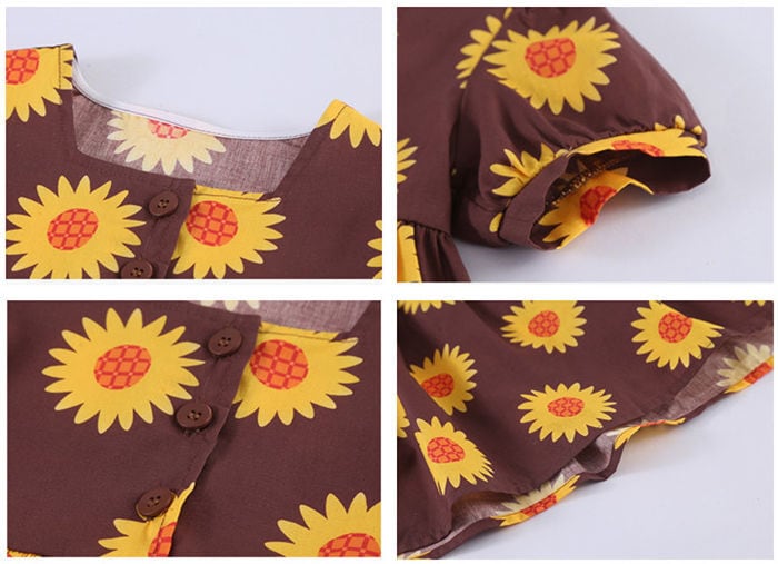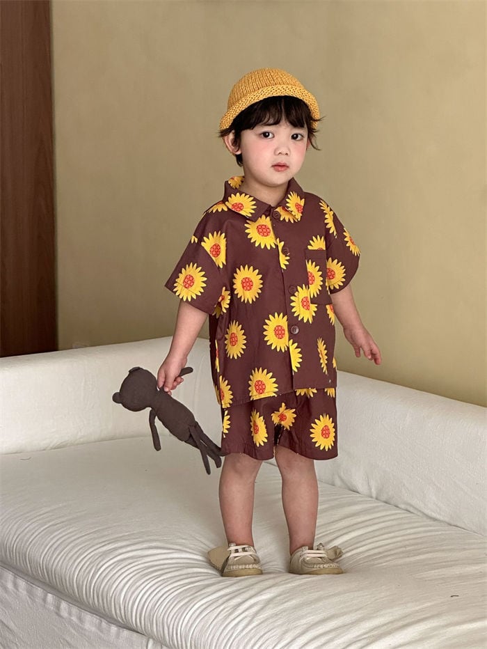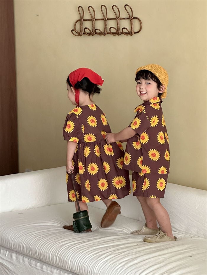 ★特徴:夏の楽しいお出かけにぴったりなワンピースセットアップが新登場!明るいひまわりの花柄が特徴のこのアイテムは、半袖シャツとショートパンツの組み合わせで、涼しさと動きやすさを両立しています。兄弟や姉妹でのお揃いコーデにも最適で、家族みんなで楽しい思い出を作ることができるデザインです。公園での遊びや休日のお出かけに、カジュアルでスタイリッシュなスタイルをおすすめします。