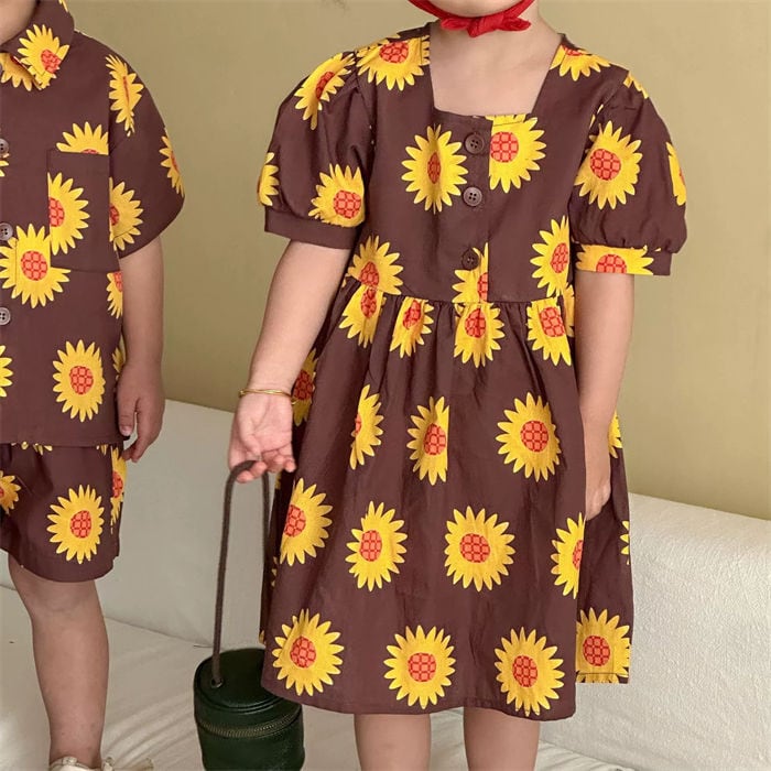 ワンピース セットアップ 女の子 男の子 子供用 80-150㎝ 花柄 ひまわり 兄弟 姉妹 半袖シャツ ショートパンツ キッズ ベビー 夏 26LT558