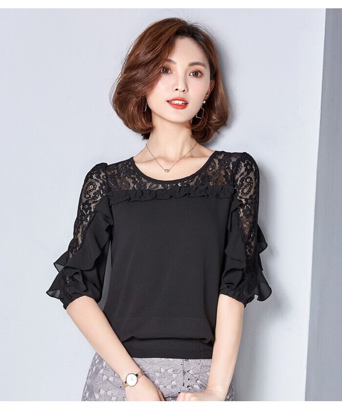 ★商品名:ブラウス レース 切り替え フリル レディース トップス シャツ ブラウス 五分袖 クールネック 穴 無地 上品 かわいい デート カジュアル ブラウス