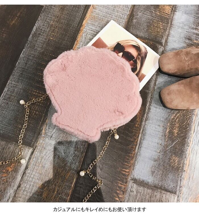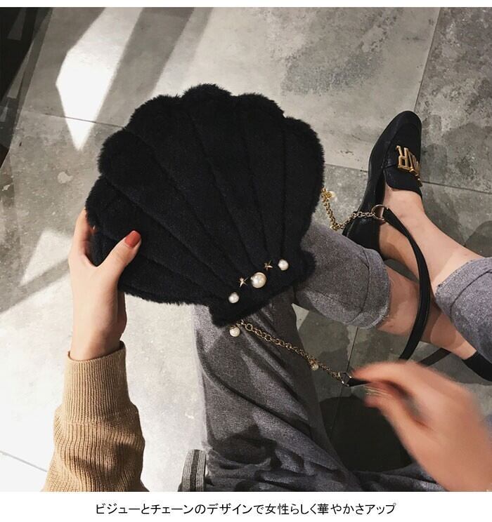 ★特徴:ポシェット レディース 貝殻モチーフ ビジュー付き ショルダーバッグ チェーンストラップ 斜め掛け ファスナー付き もこもこ ふわふわ