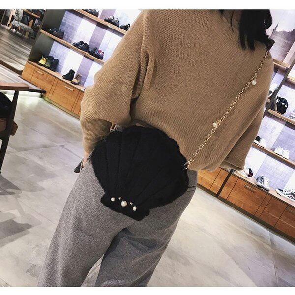 ★商品名:ポシェット レディース 貝殻モチーフ ビジュー付き ショルダーバッグ チェーンストラップ 斜め掛け ファスナー付き もこもこ ふわふわ