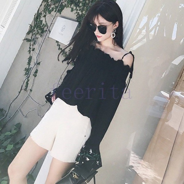 ★商品名:オフショルダー カットソー ブラウス トップス 長袖ブラウス フレア袖 肩見せ 刺繍 大きいサイズ 花柄 レディース デコルテ 長袖