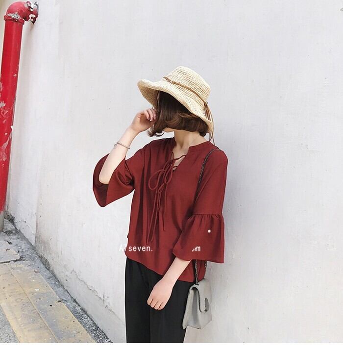 ★商品名:シフォンブラウス レディース 五分袖ブラウス ショート丈 ブラウス トップス リボン付き フレア袖 大人可愛い お洒落 ファッション