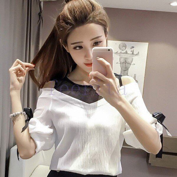 ★商品名:ブラウス シフォンブラウス 袖リボン 肩出し シャツ 5分袖 トップス