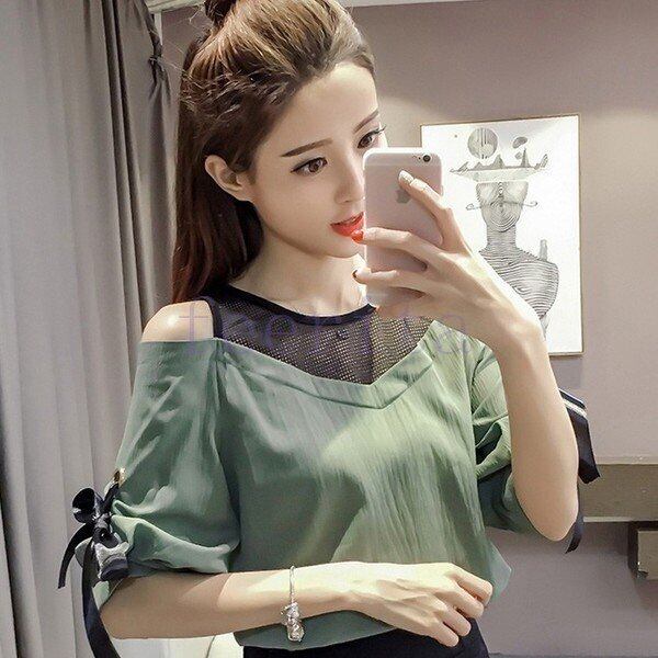 ブラウス シフォンブラウス 袖リボン 肩出し シャツ 5分袖 トップス 3260