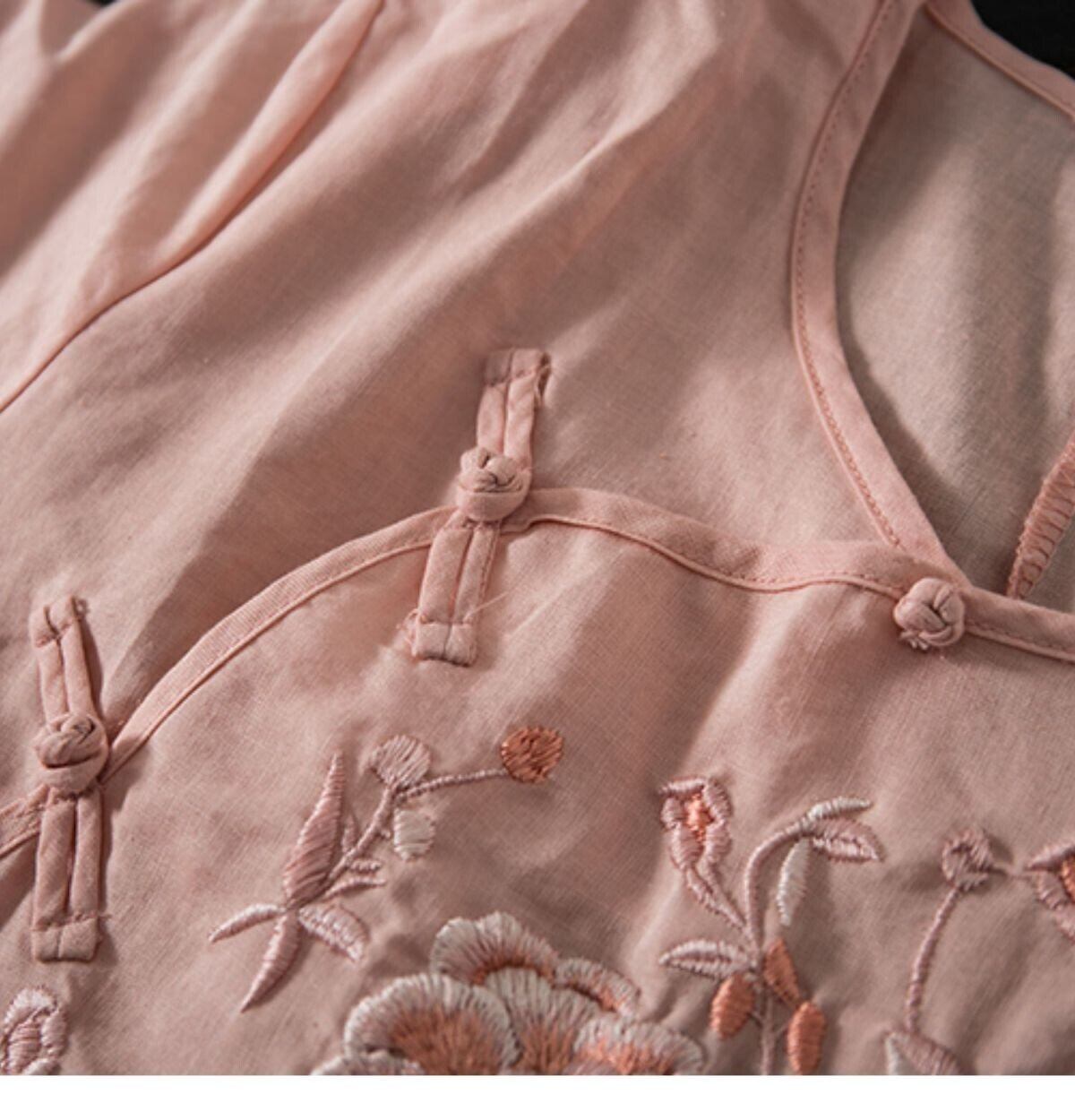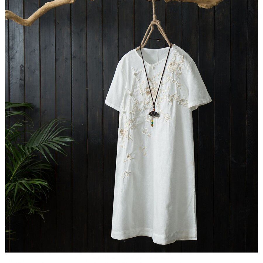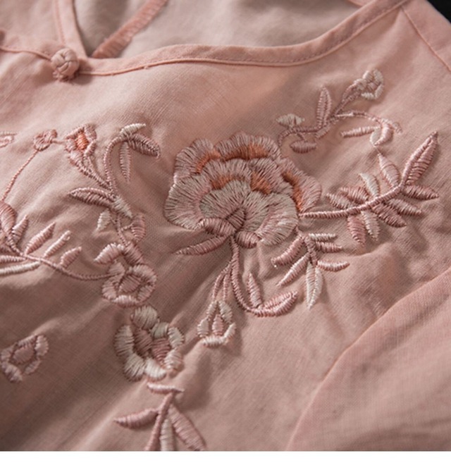 シャツ レディース 綿麻シャツ 花柄 刺繍シャツ ロングシャツ カジュアルシャツ 半袖シャツ シャツ ブラウス チャイナ風 トップスクルー 3270
