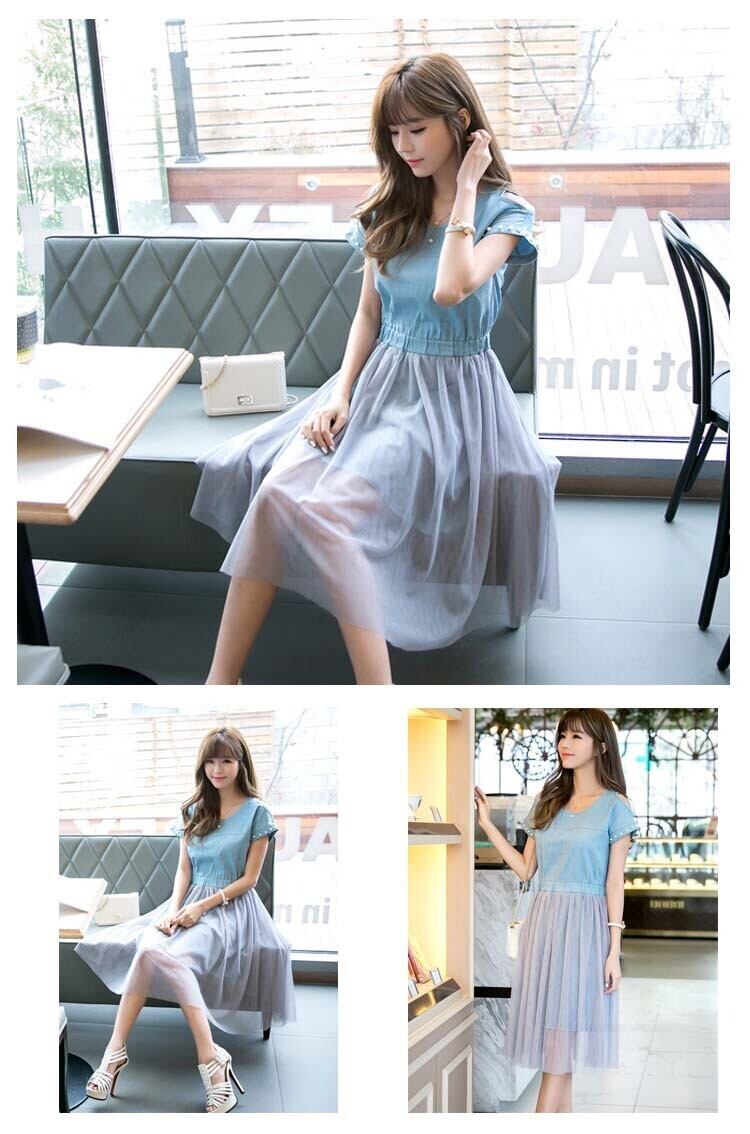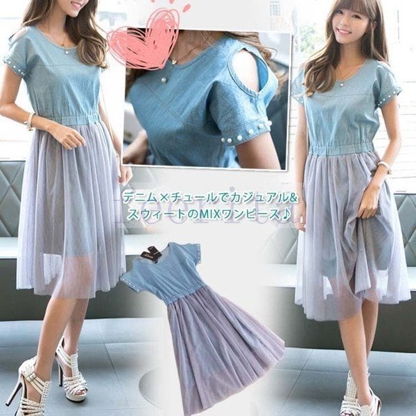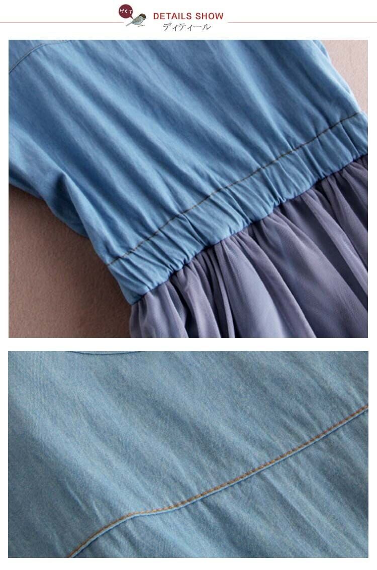 ワンピース デニム チュール 半袖ワンピース 膝丈 カジュアル&スウィートのMIXワンピース チュールワンピース デニムワンピース ドッキングワンピ 3272