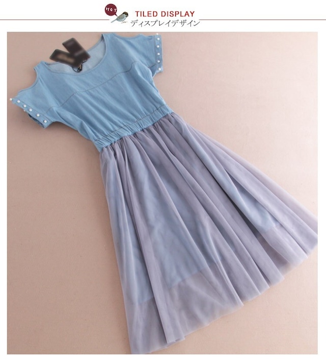 ★商品名:ワンピース デニム チュール 半袖ワンピース 膝丈 カジュアル&スウィートのMIXワンピース チュールワンピース デニムワンピース ドッキングワンピ
