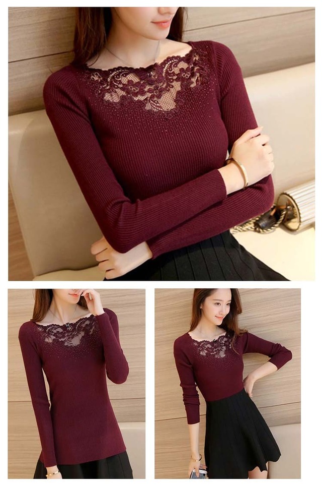 カットソー トップス 薄手ニット 長袖 リブニット スリム タイト レース切替え レース レディース 3352